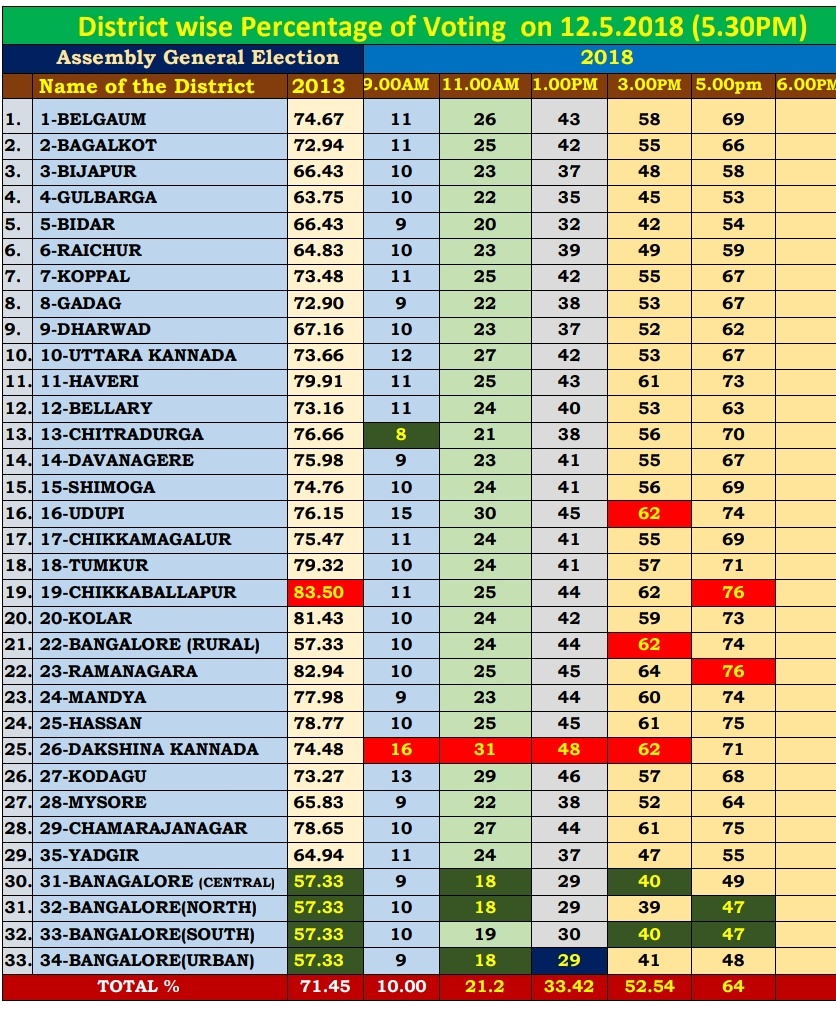 ಈವರೆಗೆ ಬಂದ ಮಾಹಿತಿ ಪ್ರಕಾರ, ರಾಜ್ಯದಲ್ಲಿ ಶೇ.74ರಷ್ಟು ಮತದಾನವಾಗಿದ್ದು, ಪ್ರತಿ ಬಾರಿಯಂತೆ ಈ ವರ್ಷವೂ ಗ್ರಾಮೀಣ ಭಾಗದಲ್ಲಿ ಮತದಾನ ಪ್ರಮಾಣ ಉತ್ತಮವಾಗಿದೆ. ಶೇ.80ರಷ್ಟು ಮತದಾನದ ಗುರಿ ಇಟ್ಟುಕೊಂಡ ಚುನಾವಣಾ ಆಯೋಗ ಸಾಕಷ್ಟು ಪ್ರಯೋಗಗಳನ್ನು ಮಾಡಿದರೂ, ನಿರೀಕ್ಷಿಸಿದ ಮಟ್ಟದಲ್ಲಿ ಫಲ ನೀಡಿಲ್ಲ.