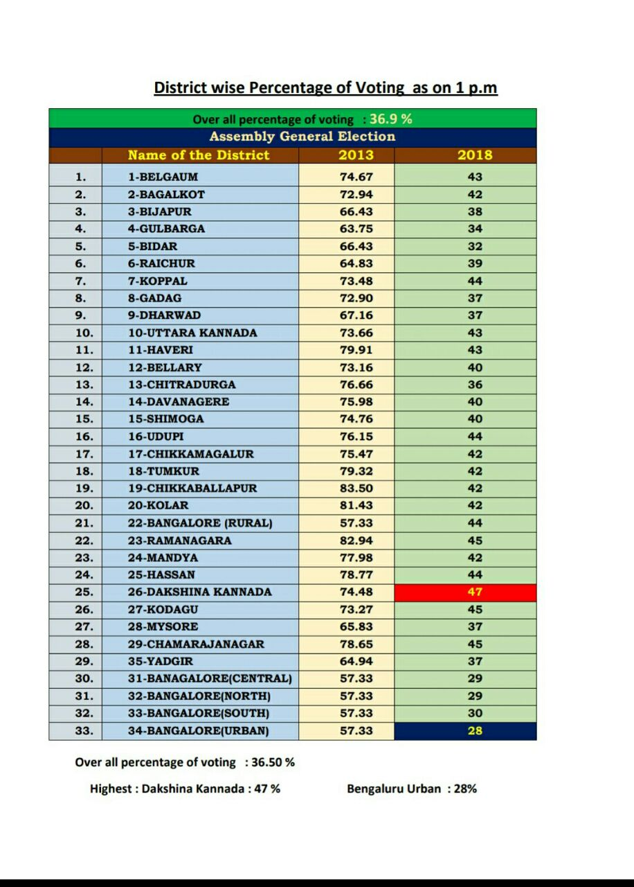 ಒಂದು ಗಂಟೆಯ ವೇಳೆಗೆ ರಾಜ್ಯದಾದ್ಯಂತ ಒಟ್ಟಾರೆ 36.9% ರಷ್ಟು ಮತದಾನವಾಗಿದೆ. ಇನ್ನು ಜಿಲ್ಲಾವಾರು ವಿಭಾಗದಲ್ಲಿ ದಕ್ಷಿಣಕನ್ನಡ ಜಿಲ್ಲೆಯಲ್ಲಿ ಇದುವರೆಗೆ ಶೇ.47% ಮತದಾನವಾಗುವುದರೊಂದಿಗೆ ಮೊದಲ ಸ್ಥಾನದಲ್ಲಿದ್ದರೆ ಬೆಂಗಳೂರು ಗ್ರಾಮಾಂತರದಲ್ಲಿ ಕೇವಲ 28%ರಷ್ಟು ಮಾತ್ರ ಮತದಾನವಾಗಿದ್ದು ಕೊನೆಯ ಸ್ಥಾನದಲ್ಲಿದೆ.