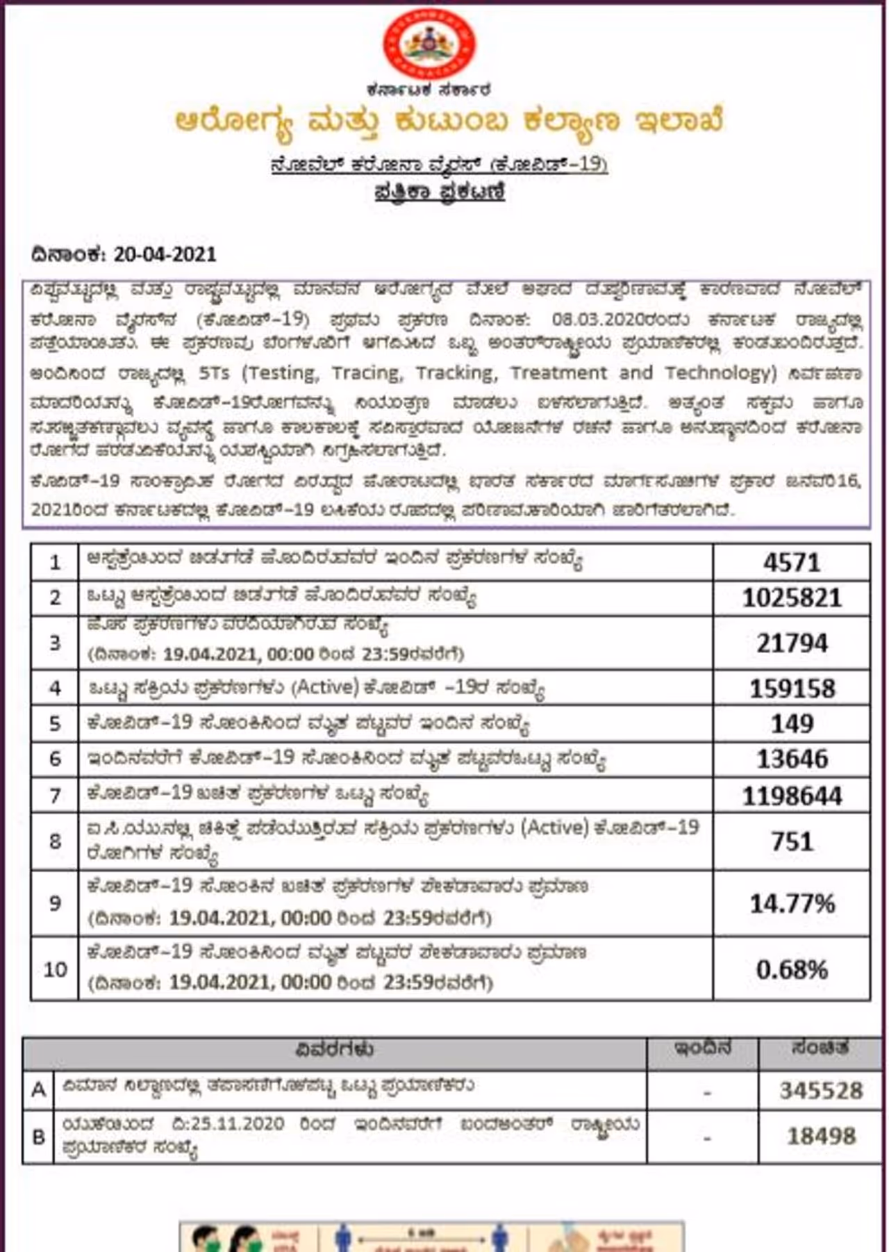 ಕರ್ನಾಟಕದಲ್ಲಿ ಕೊರೋನಾ ಎರಡನೇ ಅಲೆ ಅಬ್ಬರ/ ಹಿಂದಿನ ಎಲ್ಲ ದಾಖಲೆಗಳನ್ನು ಮುರಿದ ಮಹಾಮಾರಿ/ ಒಂದೇ ದಿನ ಇಪ್ಪತ್ತು ಸಾವಿರ ಪ್ರಕರಣ/ ಬೆಂಗಳೂರಿನಲ್ಲಿ 13782 ಪ್ರಕರಣ