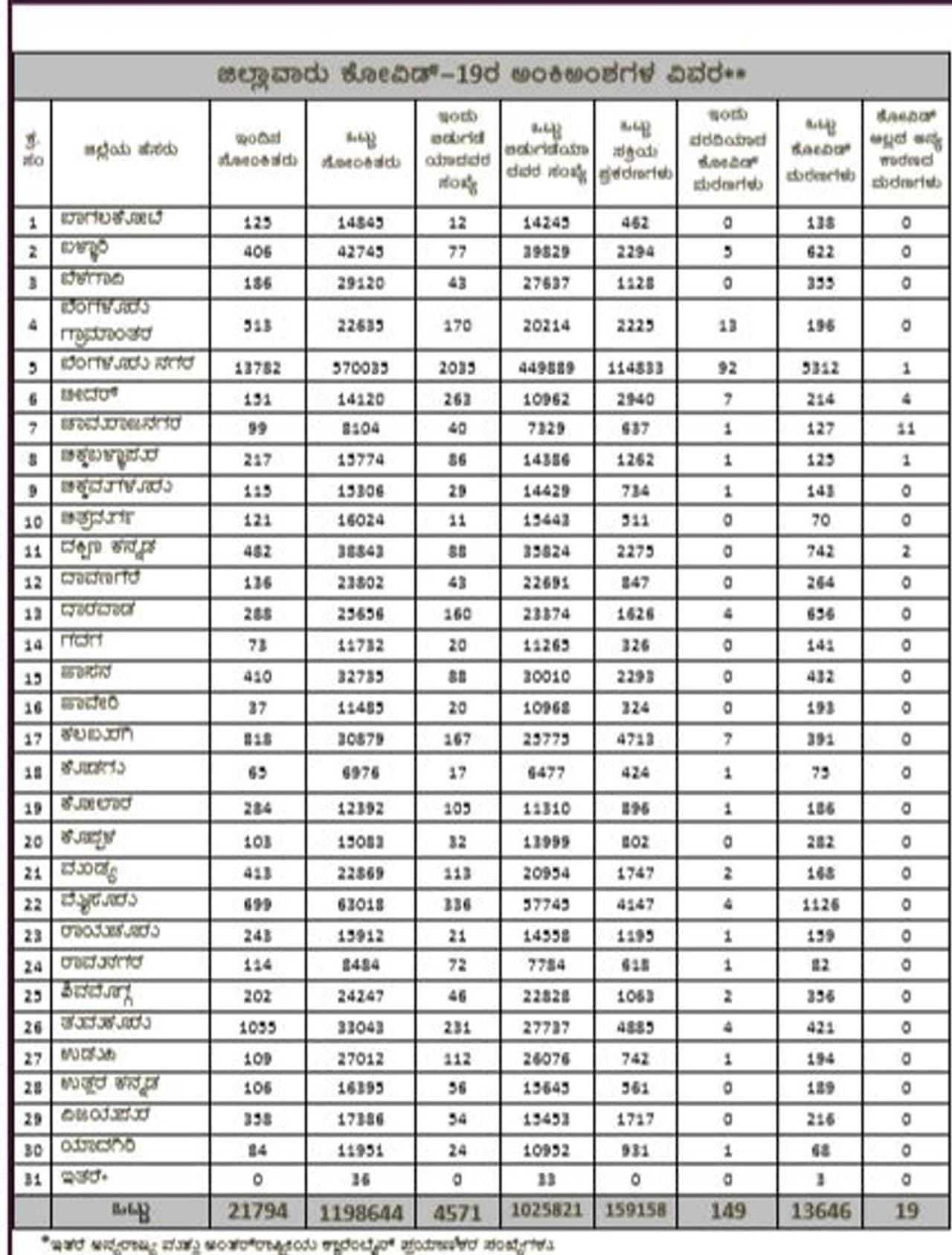 ಇನ್ನು ಕಳೆದ 24 ಗಂಟೆಗಳಲ್ಲಿ 4571 ಜನರು ಸೇರಿದಂತೆ ಇದುವರೆಗೆ 10,25821 ಸೋಂಕಿತರು ಸಂಪೂರ್ಣವಾಗಿ ಗುಣಮುಖರಾಗಿ ಆಸ್ಪತ್ರೆಯಿಂದ ಡಿಸ್ಚಾರ್ಜ್ ಆಗಿದ್ದಾರೆ. ಹೀಗಾಗಿ ರಾಜ್ಯದಲ್ಲಿ 159158 ಸಕ್ರಿಯ ಪ್ರಕರಣಗಳಿವೆ.