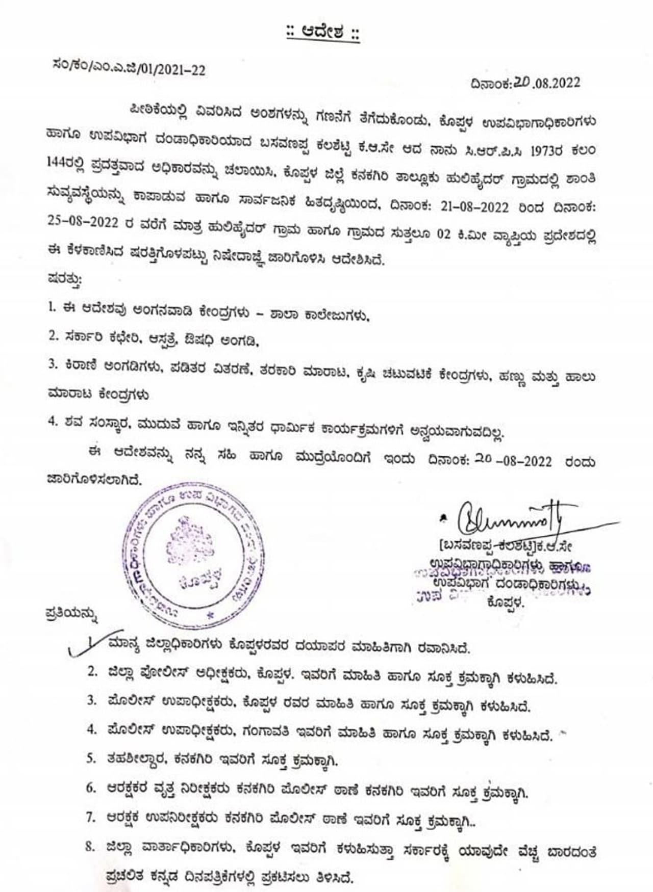 ಇದೀಗ ಮತ್ತೆ ಹುಲಿಹೈದರ್ ಗ್ರಾಮದಲ್ಲಿ ಐದು ದಿನ 144 ಸೆಕ್ಷನ್ ಜಾರಿ ಮಾಡಲಾಗಿದ್ದು ಶಾಂತಿ ಸುವ್ಯವಸ್ಥೆ ಕಾಪಾಡುವಂತೆ ಐದು ದಿನ ನಿಷೇಧಾಜ್ಞೆ ಮುಂದುವರಿಸಲಾಗಿದೆ. ಸಾರ್ವಜನಿಕರ ಹಿತದೃಷ್ಟಿಯಿಂದ ಹುಲಿಹೈದರ್ ಗ್ರಾಮದಲ್ಲಿ ನಿಷೇಧಾಜ್ಞೆ ಮುಂದುವರಿಸಲಾಗಿದೆ ಅಂತ ಕೊಪ್ಪಳ ಉಪವಿಭಾಗ ಅಧಿಕಾರಿ ಬಸವಣ್ಣಪ್ಪ ಕಲಶೆಟ್ಟಿ ಮಾಹಿತಿ ನೀಡಿದ್ದಾರೆ.