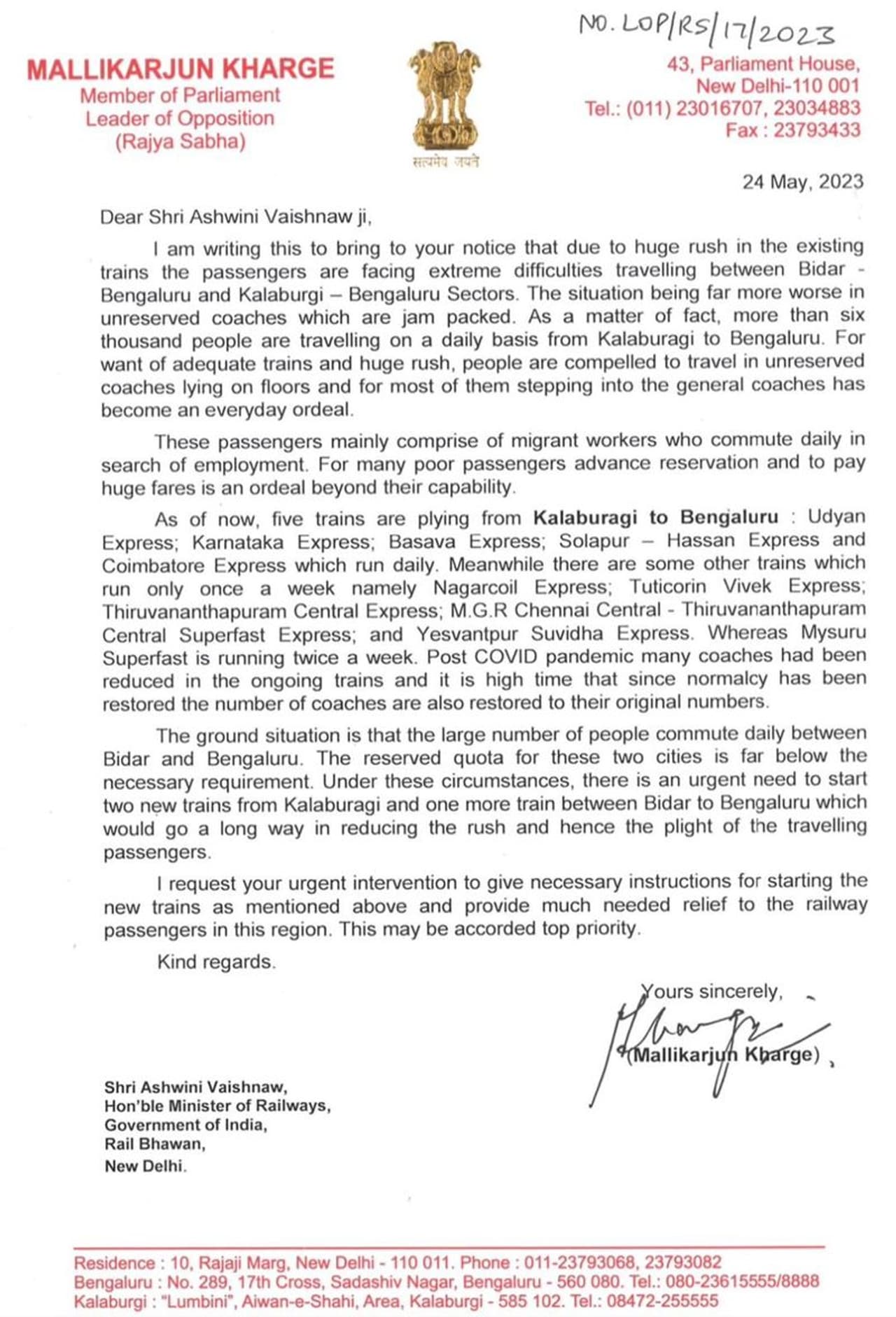 ಬೀದರ್ ಹಾಗೂ ಬೆಂಗಳೂರು ನಡುವೆ ಸಂಚರಿಸುವ ಪ್ರಯಾಣಿಕರ ಸಂಖ್ಯೆ ಹೆಚ್ಚಾಗಿದ್ದು ಈ ಎರಡು ನಗರಗಳಿಗೆ ನಿಗದಿಪಡಿಸಿದ ಮೀಸಲಿರಿಸಿರುವ ಆಸನಗಳ ಸಂಖ್ಯೆ ತೀರಾ ಕಡಿಮೆಯಾಗಿದೆ. ಇಂತಹ ಪರಿಸ್ಥಿತಿಯಲ್ಲಿ ತಕ್ಷಣವೇ ಜಾರಿಗೆ ಬರುವಂತೆ ಕಲಬುರಗಿ- ಬೆಂಗಳೂರು ನಡುವೆ ಎರಡು ನೂತನ ರೈಲುಗಳು ಹಾಗೂ ಬೀರ್ದ- ಬೆಂಗಳೂರು ನಡುವೆ ಒಂದು ನೂತನ ರೈಲು ಓಡಿಸುವ ಅವಶ್ಯಕತೆ ಇದ್ದು ಇದರಿಂದ ಜನಸಂದಣಿ ಕಡಿಮೆಯಾಗುವುದರ ಜೊತೆಗೆ ಪ್ರಯಾಣಿಕರು ಎದುರಿಸುತ್ತಿರುವ ಅನಾನುಕೂಲತೆ ಕಡಿಮೆಯಾಗಲಿದೆ ಎಂದೂ ಪತ್ರದ ಮೂಲಕ ಖರ್ಗೆ ಅವರು ರೇಲ್ವೆ ಸಚಿವರ ಗಮನ ಸೆಳೆದಿದ್ದಾರೆ.