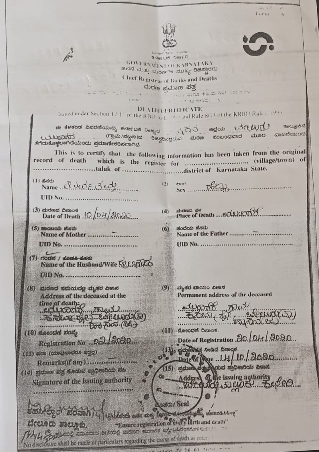 ಹಾಸನ ಜಿಲ್ಲೆಯ ಬೇಲೂರು ತಾಲ್ಲೂಕಿನ ಮುದಿಗೆರೆಯಲ್ಲಿ ನಡೆದ ಘಟನೆ, ಪಾರ್ವತಮ್ಮ ಮೃತ ರಾಗಿದ್ದಾರೆಂದು ಮರಣ ಪತ್ರ, ತಾಲ್ಲೂಕು ಕಚೇರಿಯಿಂದಲೇ ಮರಣ ಪತ್ರ ವಿತರಣೆ.