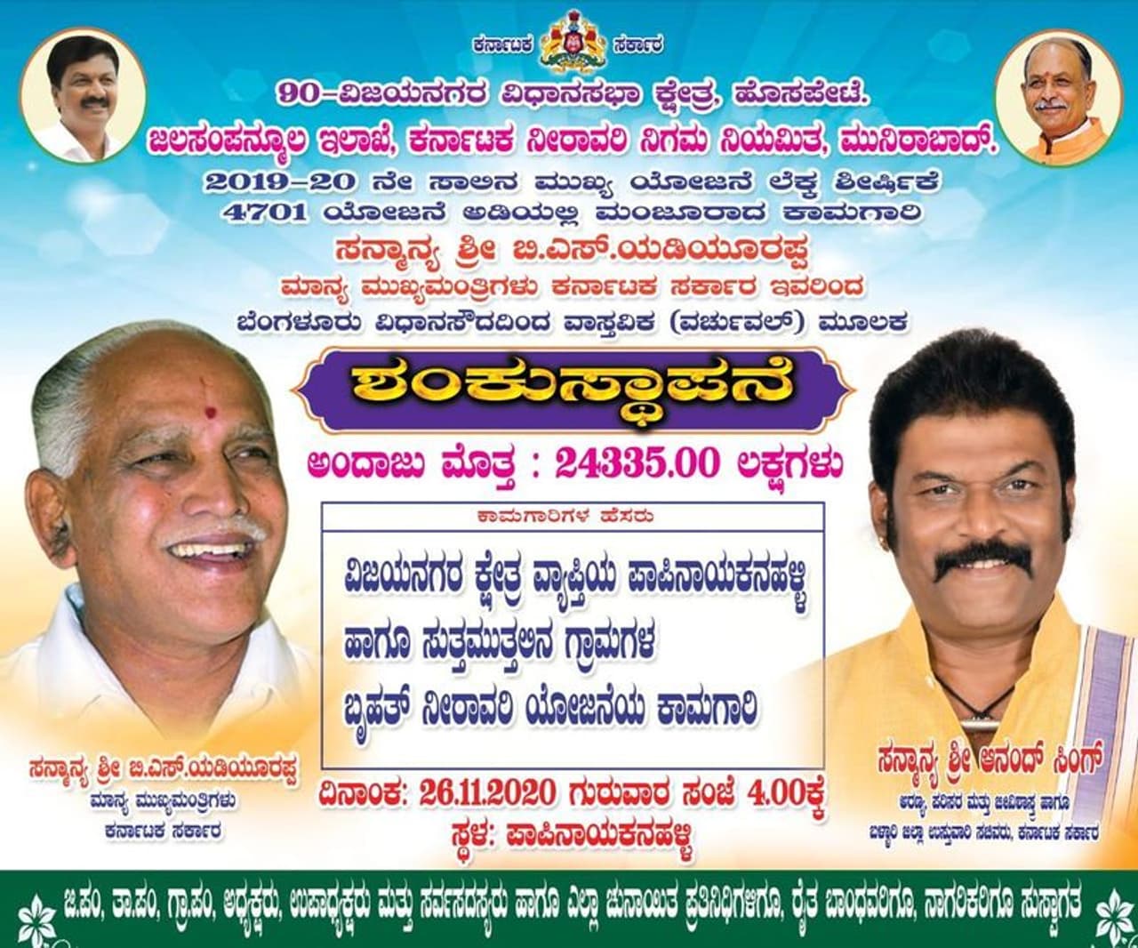 ವಿಜಯನಗರದಲ್ಲಿ ಅಂದಾಜು 243 ಕೋಟಿ ರೂಪಾಯಿಗಳ ಬೃಹತ್ ನೀರಾವರಿ ಯೋಜನೆಗೆ ಸಿಎಂ ಚಾಲನೆ ನೀಡಲಿದ್ದಾರೆ. ವಿಜಯನಗರ ಕ್ಷೇತ್ರ ವ್ಯಾಪ್ತಿಯಲ್ಲಿ ಪಾಪಿನಾಯಕನಹಳ್ಳಿ ಹಾಗೂ ಸುತ್ತಮುತ್ತಲಿನ ಗ್ರಾಮಗಳ ಬೃಹತ್ ನೀರಾವರಿ ಯೋಜನೆಗೆ ಯಡಿಯೂರಪ್ಪ ಚಾಲನೆ ನೀಡಲಿದ್ದಾರೆ.