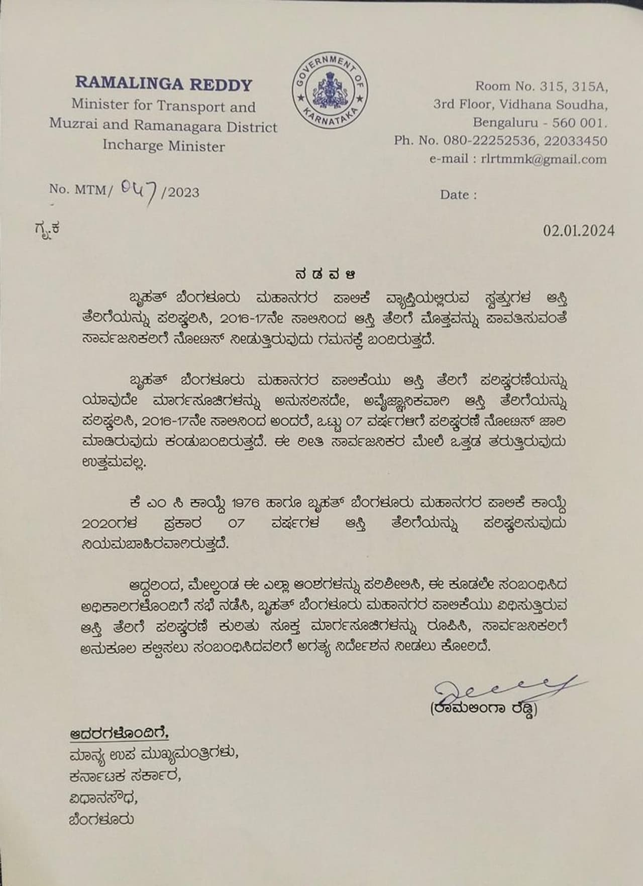 ಈ ಕುರಿತು ಸಾರಿಗೆ ಸಚಿವ ರಾಮಲಿಂಗಾರೆಡ್ಡಿ ಅವರು ಬಿಬಿಎಂಪಿ ಸ್ವತ್ತುಗಳ ಆಸ್ತಿ ತೆರಿಗೆ ಪರಿಷ್ಕರಣೆ ವಿಚಾರವಾಗಿ ಬೆಂಗಳೂರು ಉಸ್ತುವಾರಿ ಸಚಿವ ಡಿ.ಕೆ ಶಿವಕುಮಾರ್ ಗೆ ಪತ್ರ ಬರೆದಿದ್ದಾರೆ. ಬೆಂಗಳೂರಿನ ನಿವಾಸಿಗಳ ಮೇಲೆ ಒತ್ತಡ ತರುವುದು ಸರಿಯಲ್ಲ ಎಂದು ಪತ್ರ ಬರೆದು ಬೇಸರ ವ್ಯಕ್ತಪಡಿಸಿದ್ದಾರೆ. ಬಿಬಿಎಂಪಿ ವ್ಯಾಪ್ತಿಯಲ್ಲಿರುವ ಸ್ವತ್ತುಗಳ ಆಸ್ತಿ ತೆರಿಗೆಯನ್ನು ಪರಿಷ್ಕರಿಸಿ 2016-17ನೇ ಸಾಲಿನಿಂದ ಆಸ್ತಿ ತೆರಿಗೆ ಮೊತ್ತವನ್ನು ಪಾವತಿಸುವಂತೆ ನೋಟಿಸ್ ನೀಡಲಾಗಿದೆ. ಈ ಬಗ್ಗೆ ಸಾರ್ವಜನಿಕರಿಗೆ ನೋಟಿಸ್ ನೀಡುತ್ತಿರುವುದು ಗಮನಕ್ಕೆ ಬಂದಿರುತ್ತದೆ.