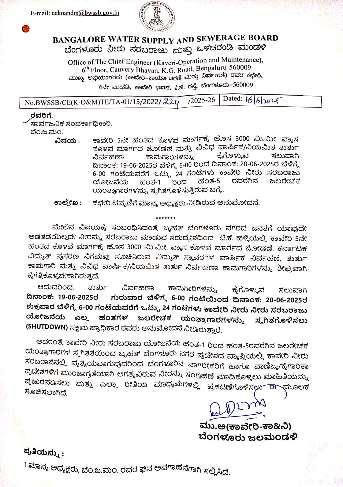 - ಕಾರಣ: ಕಾವೇರಿ ಹಂತ-5 ಕೊಳವೆ ಜೋಡಣೆ, ವಿದ್ಯುತ್ ನಿರ್ವಹಣೆ, ತುರ್ತು ತಪಾಸಣೆ