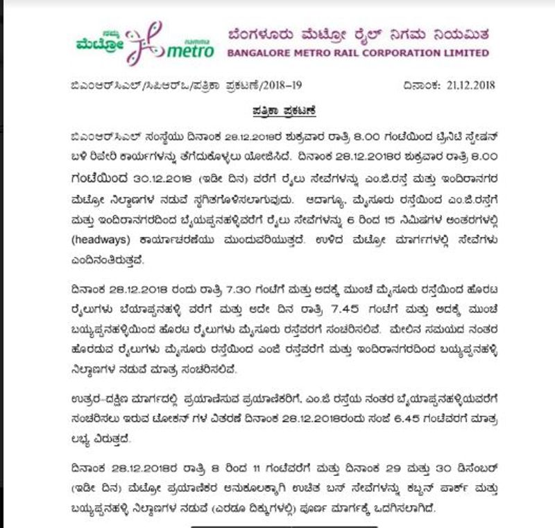 ಮೈಸೂರು ರಸ್ತೆಯಿಂದ ಎಂಜಿ ರಸ್ತೆ, ಇಂದಿರಾನಗರದಿಂದ ಬೈಯ್ಯಪ್ಪನಹಳ್ಳಿ ವರೆಗೆ ರೈಲು ಸೇವೆ 6 ರಿಂದ 15 ನಿಮಿಷಗಳ ಅಂತರದಲ್ಲಿ ಮುಂದುವರೆಯಲಿದೆ. ದಿನಾಂಕ 28 ರಂದು ರಾತ್ರಿ ಎಂಟರಿಂದ 11ಘಂಟೆ ಹಾಗೂ ದಿನಾಂಕ 29, 30 ರಂದು ಮೆಟ್ರೋ ಪ್ರಯಾಣಿಕರಿಗೆ ಉಚಿತ ಬಸ್ ಸೇವೆಯನ್ನ ಬಿಎಂಆರ್ ಸಿಎಲ್ ಕಲ್ಪಿಸಿದೆ.