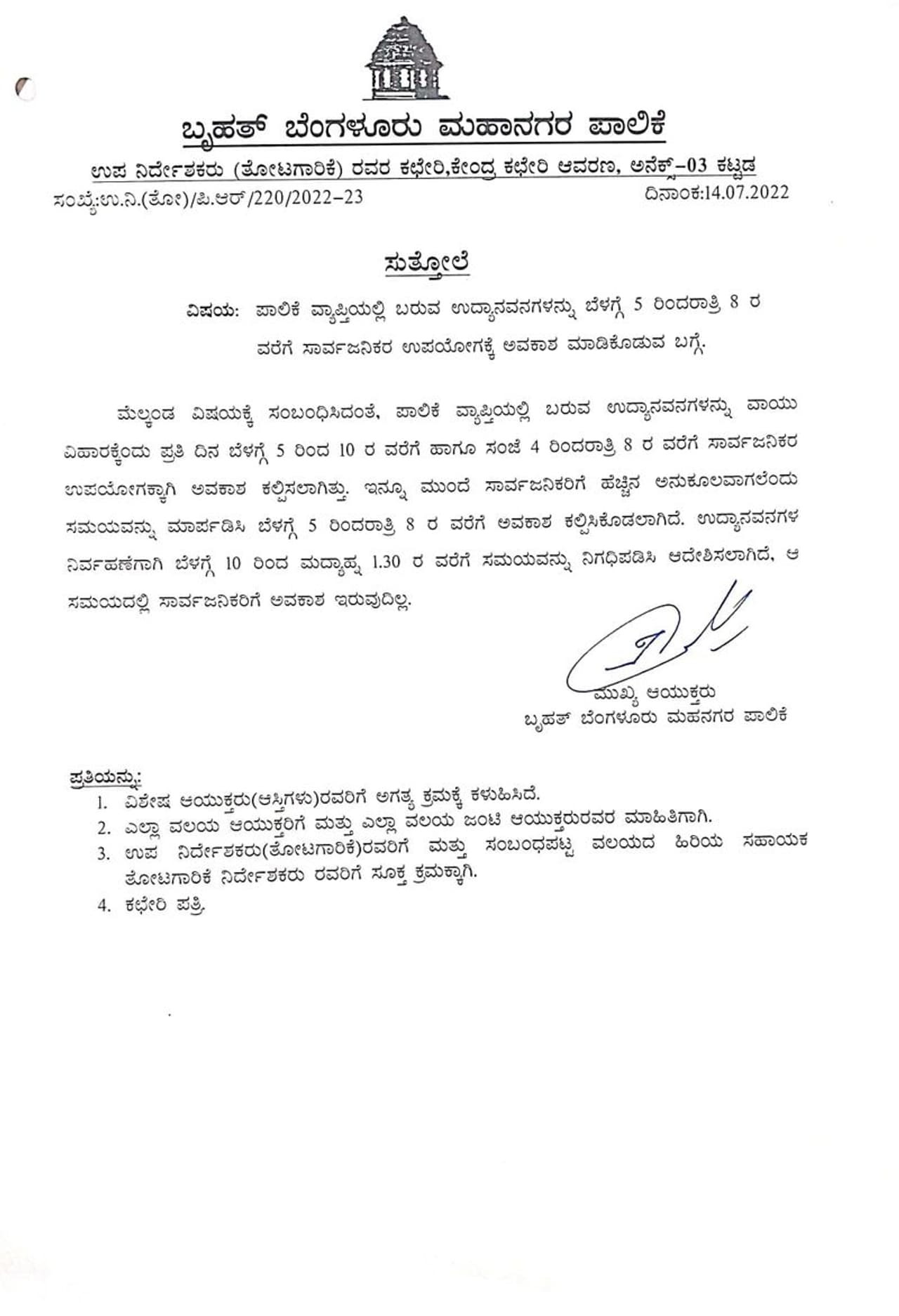 ಕೋವಿಡ್ ನಂತರ ಉದ್ಯಾನಗಳಿಗೆ ಮುಕ್ತ ಅವಕಾಶ: ಕೋವಿಡ್ ಹಿನ್ನೆಲೆಯಲ್ಲಿ ಬೆಂಗಳೂರಿನ ಬಿಬಿಎಂಪಿ ವ್ಯಾಪ್ತಿಯ ಎಲ್ಲ ಉದ್ಯಾನಗಳು, ಪಾರ್ಕ್ಗಳನ್ನು ಸಾರ್ವಜನಿಕರ ಪ್ರವೇಶಕ್ಕೆ ನಿರ್ಬಂಧ ವಿಧಿಸಲಾಗಿತ್ತು. ಕೋವಿಡ್ ಸಾಂಕ್ರಾಮಿಕ ಸೋಂಕು ಇಳಿಕೆ ಆಗುತ್ತಿದ್ದಂತೆ ಉದ್ಯಾನಗಳ ಪ್ರವೇಶಕ್ಕೂ ಅವಕಾಶ ನೀಡುತ್ತಾ ಬಂದಿದೆ. ಆದರೆ. ಕೋವಿಡ್ ಬರುವುದಕ್ಕೂ ಮುಂಚೆ ಇದ್ದ ಅವಧಿಯನ್ನು ಮರು ಜಾರಿಗೆ ತರುವಲ್ಲಿ ಬಿಬಿಎಂಪಿ ಹಿಂದೇಟು ಹಾಕಿತ್ತು. ಆದರೆ, ಈಗ ಸಾರ್ವಜನಿಕರಿಗೆ ಹೆಚ್ಚಿನ ಅನುಕೂಲವಾಗುವ ನಿಟ್ಟಿನಲ್ಲಿ ಬಿಬಿಎಂಪಿ ಮುಖ್ಯ ಆಯುಕ್ತ ತುಷಾರ್ ಗಿರಿನಾಥ್ ಅವರು ಸುತ್ತೋಲೆ ಹೊರಡಿಸಿದ್ದಾರೆ.