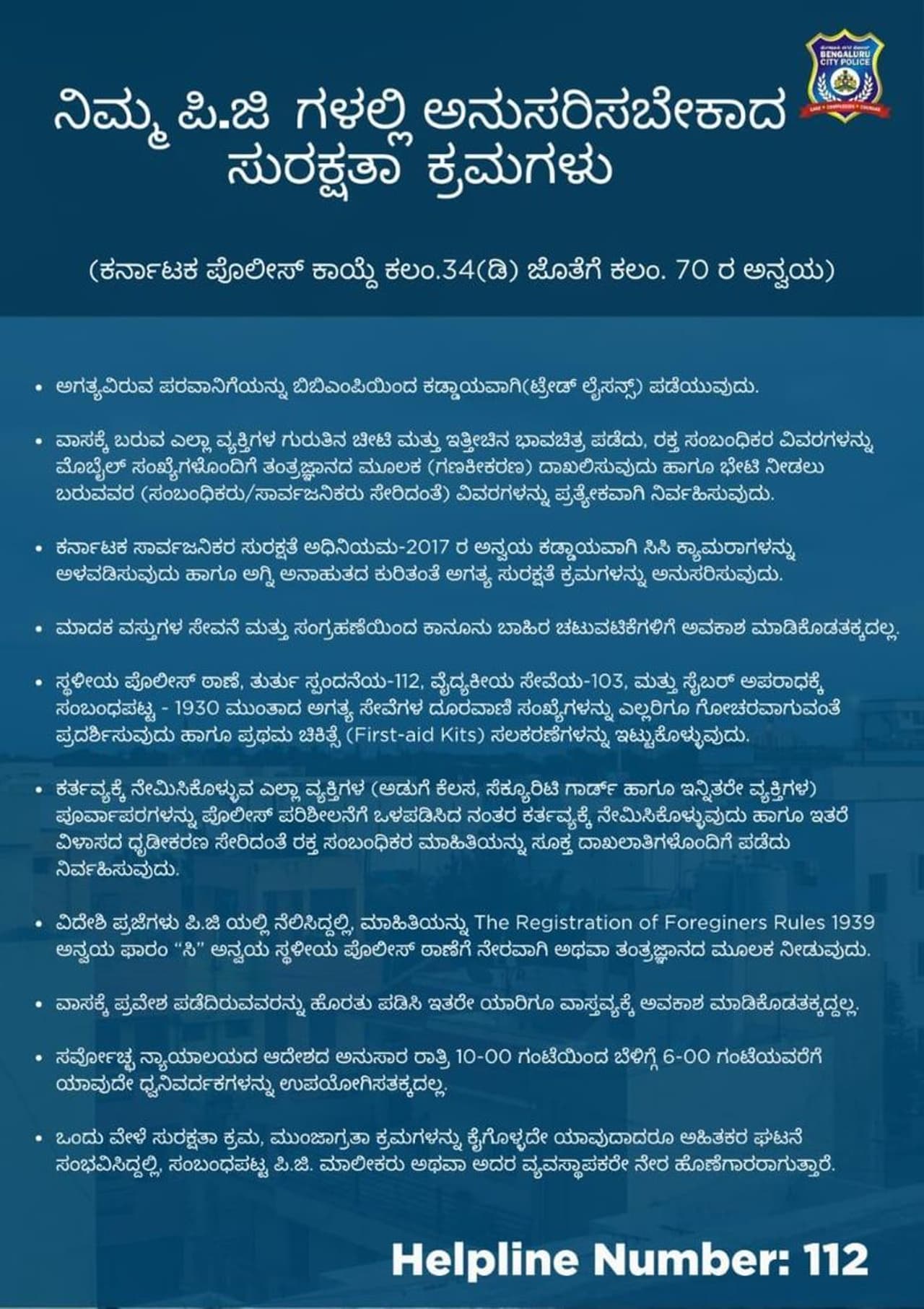 ಬೆಂಗಳೂರು ಪೇಯಿಂಗ್ ಗೆಸ್ಟ್ (ಪಿಜಿ)ಗಳಿಗೆ ಪೊಲೀಸ್ ಇಲಾಖೆಯಿಂದ ಹೊಸ ಮಾರ್ಗಸೂಚಿಗಳನ್ನು ಬಿಡುಗಡೆ ಮಾಡುವ ಮೂಲಕ ಸುರಕ್ಷತೆ ಬಗ್ಗೆ ನಿಗಾವಹಿಸಲಾಗಿದೆ.