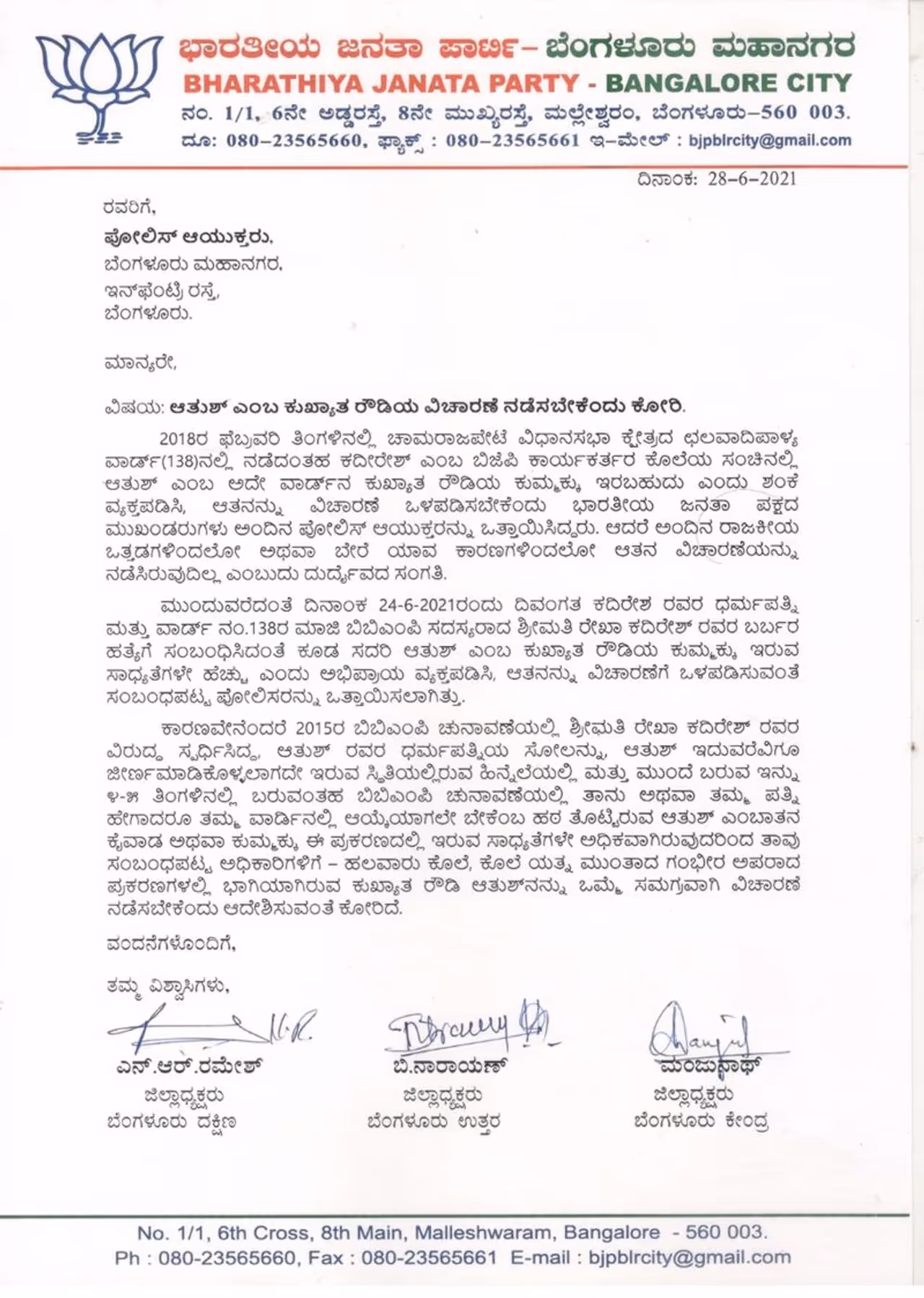 2018ರ ಚಾಮರಾಜಪೇಟೆ ವಿಧಾನಸಭಾ ಕ್ಷೇತ್ರದ ಛಲವಾದಿಪಾಳ್ಯ ವಾರ್ಡ್ನಲ್ಲಿ ನಡೆದಂತಹ ರೇಖಾ ಕದಿರೇಶ್ ಅವರ ಪತಿ ಕದಿರೇಶ್ ಬಿಜೆಪಿ ಕಾರ್ಯಕರ್ತನ ಕೊಲೆಯ ಸಂಚಿನಲ್ಲಿ ಕುಖ್ಯಾತ ರೌಡಿ ಅತೂಶ್ ಕುಮ್ಮಕ್ಕು ಇರಬಹುದು ಎಂದು ಶಂಕೆ ವ್ಯಕ್ತಪಡಿಸಿ ಆತನನ್ನು ವಿಚಾರಣೆಗೊಳಪಡಿಸಬೇಕು ಎಂದು ಬಿಜೆಪಿ ಮುಖಂಡರು ಒತ್ತಾಯಿಸಿದ್ದಾರೆ. ಕಳೆದ ಬಾರಿ ಕದಿರೇಶ್ ಹತ್ಯೆ ಕೇಸ್ನಲ್ಲೂ ಅತೂಶ್ನನ್ನ ವಿಚಾರಣೆ ಮಾಡಿಲ್ಲ. ಈ ಬಾರಿ ಅತೂಶ್ನನ್ನ ವಿಚಾರಣೆ ಮಾಡುವಂತೆ ಬಿಜೆಪಿ ಮುಖಂಡರು ಮನವಿ ಮಾಡಿದ್ದಾರೆ.