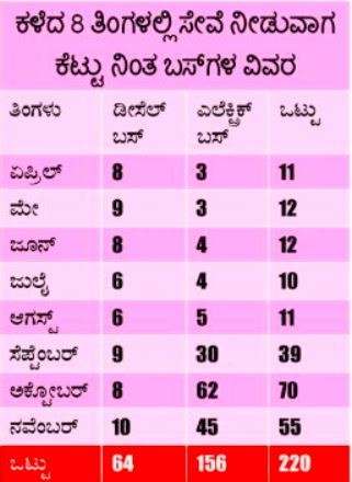 ಬಿಎಂಟಿಸಿಯ ಅಂಕಿ-ಅಂಶದಂತೆಯೇ ಏಪ್ರಿಲ್ ನಿಂದ ನವೆಂಬರ್ವರೆಗೆ 220 ಬಸ್ಗಳು ಬ್ರೇಕ್ ಡೌನ್ ಆಗಿ ರಸ್ತೆ ಮಧ್ಯದಲ್ಲಿಯೇ ನಿಂತು ಸಮಸ್ಯೆ ಸೃಷ್ಟಿ ಮಾಡಿತ್ತು. ಅದರಲ್ಲಿ ಎಲೆಕ್ನಿಕ್ ಬಸ್ಗಳೇ ಅತಿಹೆಚ್ಚು ರಸ್ತೆ ಮಧ್ಯದಲ್ಲಿ ನಿಂತಿವೆ. ಪ್ರಸಕ್ತ ವರ್ಷದ ಮೊದಲ 8 ತಿಂಗಳಲ್ಲಿ 220 ಬಸ್ ಗಳು ರಸ್ತೆ ಮಧ್ಯದಲ್ಲಿ ನಿಂತಿದ್ದು, ಅದರಲ್ಲಿ 64 ಡೀಸೆಲ್ ಮೂಲಕ ಸಂಚರಿಸುವ ಬಸ್ಗಳಾಗಿದ್ದರೆ, ಉಳಿದ 156 ಎಲೆಕ್ಟಿಕ್ ಬಸ್ಗಳಾಗಿವೆ.