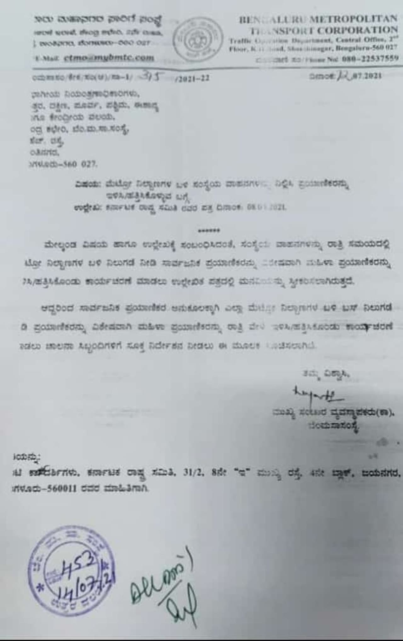 ಎಲ್ಲಾ ಮೆಟ್ರೋ ನಿಲ್ದಾಣಗಳ ಮುಂದೆ ಬಿಎಂಟಿಸಿ ಬಸ್ ಗಳನ್ನು ನಿಲ್ಲಿಸುವಂತೆ ಸೂಚನೆ ನೀಡಲಾಗಿದೆ. ರಾತ್ರಿ ವೇಳೆಯಲ್ಲಿ ಮೆಟ್ರೋ ನಿಲ್ದಾಣದ ಮುಂದೆ ಬಿಎಂಟಿಸಿ ಬಸ್ ಗಳ ನಿಲುಗಡೆಗೆ ಸೂಚನೆ ನೀಡಲಾಗಿದೆ.