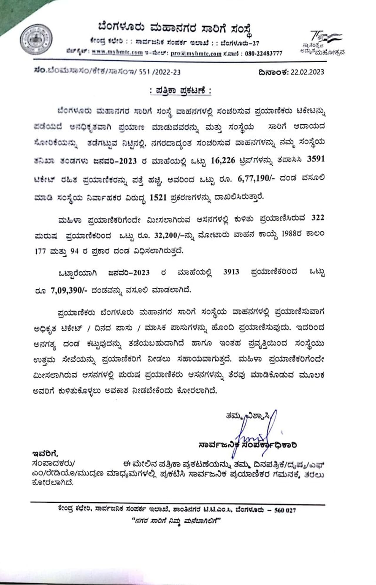 ಇನ್ನು ಪ್ರಯಾಣಿಕರು ಬೆಂಗಳೂರು ಮಹಾನಗರ ಸಾರಿಗೆ ಸಂಸ್ಥಯ ವಾಹನಗಳಲ್ಲಿ ಪ್ರಯಾಣಿಸುವಾಗ ಅಧಿಕೃತ ಟಿಕೆಟ್/ದಿನದ ಪಾಸು/ಮಾಸಿಕ ಪಾಸುಗಳನ್ನು ಹೊಂದಿ ಪ್ರಯಾಣಿಸುವುದರಿಂದ ಅನಗತ್ಯ ದಂಡ ಕಟ್ಟುವುದನ್ನು ತಡೆಯಬಹುದಾಗಿದೆ. ಹಾಗೂ ಇಂತಹ ಪ್ರವೃತ್ತಿಯಿಂದ ಸಂಸ್ಥೆಯು ಉತ್ತಮ ಸೇವೆಯನ್ನು ಪ್ರಯಾಣಿಕರಿಗೆ ನೀಡಲು ಸಹಾಯವಾಗುತ್ತದೆ. ಇನ್ನು ಮಹಿಳಾ ಪ್ರಯಾಣಿಕರಿಗೆಂದೇ ಮೀಸಲಾಗಿರುವ ಆಸನಗಳಲ್ಲಿ ಪುರುಷ ಪ್ರಯಾಣಿಕರು ಆಸನಗಳನ್ನು ತೆರವು ಮಾಡಿಕೊಡುವ ಮೂಲಕ ಅವರಿಗೆ ಕುಳಿತುಕೊಳ್ಳಲು ಅವಕಾಶ ನೀಡಬೇಕೆಂದು ಬಿಎಂಟಿಸಿಯು ತನ್ನ ಪತ್ರಿಕಾ ಪ್ರಕಟಣೆಯಲ್ಲಿ ತಿಳಿಸಿದೆ.