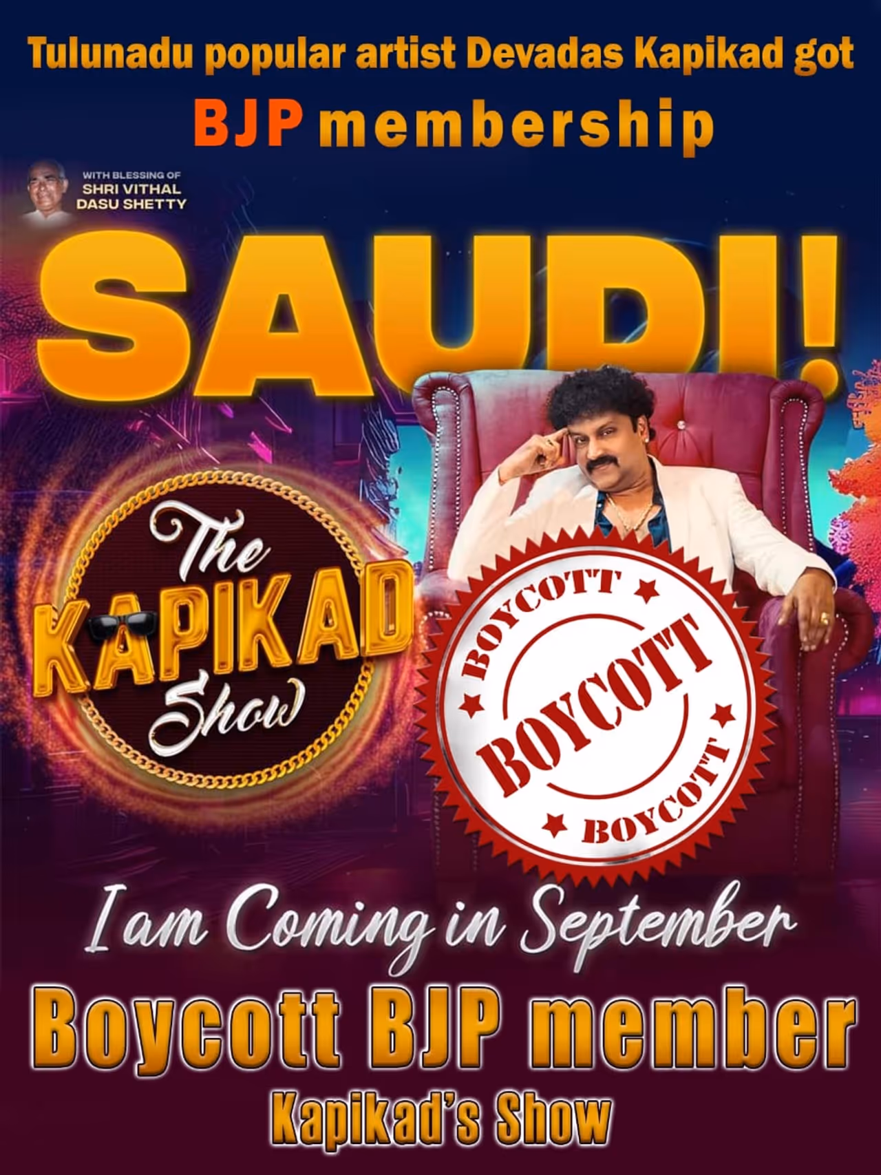 ಪ್ರಸಿದ್ಧ ತುಳು ಚಿತ್ರನಟ ದೇವದಾಸ್ ಕಾಪಿಕಾಡ್ ಅವರು ಬಿಜೆಪಿ ಸದಸ್ಯತ್ವ ಪಡೆದ ನಂತರ, ಸೌದಿ ಅರೇಬಿಯಾದಲ್ಲಿ ನಡೆಯಬೇಕಿದ್ದ ಅವರ ಕಾರ್ಯಕ್ರಮವನ್ನು ಬಹಿಷ್ಕರಿಸುವಂತೆ ಬೆದರಿಕೆ ಹಾಕಲಾಗಿದೆ. ಈ ಬೆದರಿಕೆಯಿಂದ ಕಂಗೆಟ್ಟಿರುವ ನಟ, ತಾವು ಬಿಜೆಪಿ ಸದಸ್ಯತ್ವ ಪಡೆದಿಲ್ಲ ಎಂದು ಸ್ಪಷ್ಟನೆ ನೀಡಿದ್ದಾರೆ.