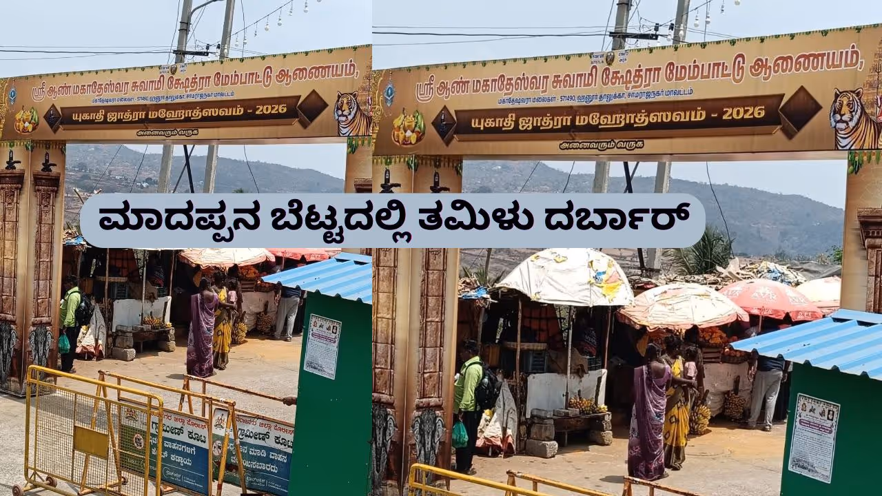 ಕರ್ನಾಟಕ ಸರ್ಕಾರದಿಂದ ಯುಗಾದಿ ಜಾತ್ರಾ ಮಹೋತ್ಸವ-2026ರ ಅಂಗವಾಗಿ ಈ ಸ್ವಾಗತ ಕಮಾನನ್ನು ಅಳವಡಿಸಲಾಗಿದೆ. ಇದರಲ್ಲಿ 'ಶ್ರೀ ಮಲೆ ಮಹದೇಶ್ವರ ಸ್ವಾಮಿ ಕ್ಷೇತ್ರ ಅಭಿವೃದ್ಧಿ ಪ್ರಾಧಿಕಾರ, ಮಹದೇಶ್ವರ ಬೆಟ್ಟ-571490, ಹನೂರು ತಾಲ್ಲೂಕು, ಚಾಮರಾಜನಗರ ಜಿಲ್ಲೆ. ಯುಗಾದಿ ಜಾತ್ರಾ ಮಹೋತ್ಸವ - 2026 ಎಲ್ಲರಿಗೂ ಸ್ವಾಗತ' ಎಂದು ಸಂಪೂರ್ಣವಾಗಿ ತಮಿಳಿನಲ್ಲಿ ಬರೆಯಲಾಗಿದೆ. ಗಡಿ ಭಾಗದ ಜಿಲ್ಲೆಯಾದ್ದರಿಂದ ತಮಿಳು ಭಕ್ತರು ಹೆಚ್ಚಿನ ಸಂಖ್ಯೆಯಲ್ಲಿ ಬರುತ್ತಾರೆ ಎಂಬ ಕಾರಣಕ್ಕೆ ತಮಿಳು ಬಳಸುವುದು ತಪ್ಪಲ್ಲ, ಆದರೆ ಕನ್ನಡವನ್ನು ಸಂಪೂರ್ಣವಾಗಿ ಕೈಬಿಟ್ಟಿರುವುದು ಕನ್ನಡಿಗರ ಸ್ವಾಭಿಮಾನಕ್ಕೆ ಪೆಟ್ಟು ನೀಡಿದೆ.