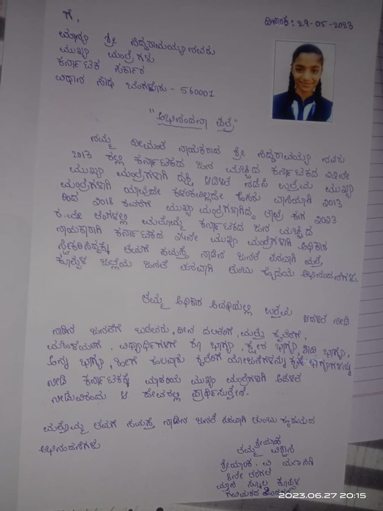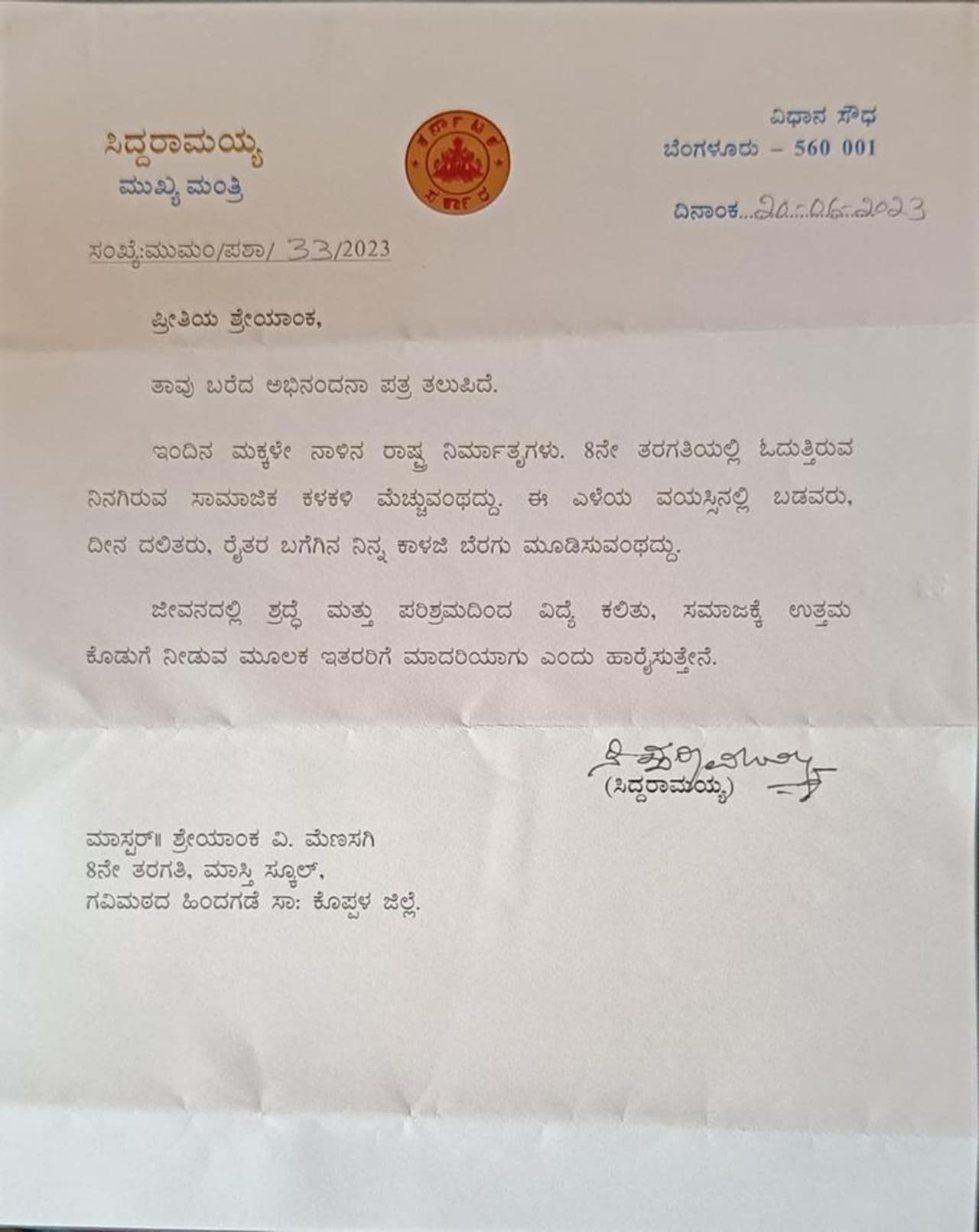 ಕೊಪ್ಪಳ ನಗರದ ಮಾಸ್ತಿ ಪಬ್ಲಿಕ್ ಸ್ಕೂಲ್ನ ವಿದ್ಯಾರ್ಥಿನಿ ಶ್ರೇಯಾಂಕ ರಾಜ್ಯದ ಮತ್ತೊಮ್ಮೆ ಮುಖ್ಯಮಂತ್ರಿಯಾದ ಸಿದ್ದರಾಮಯ್ಯ ಅವರಿಗೆ ಅಭಿನಂದಿಸಿ ಹಾಗೂ ಅವರ ಸಾಮಾಜಿಕ ಕಾಳಜಿಯ ಬಗ್ಗೆ ಪತ್ರ ಬರೆದಿದ್ದಳು.