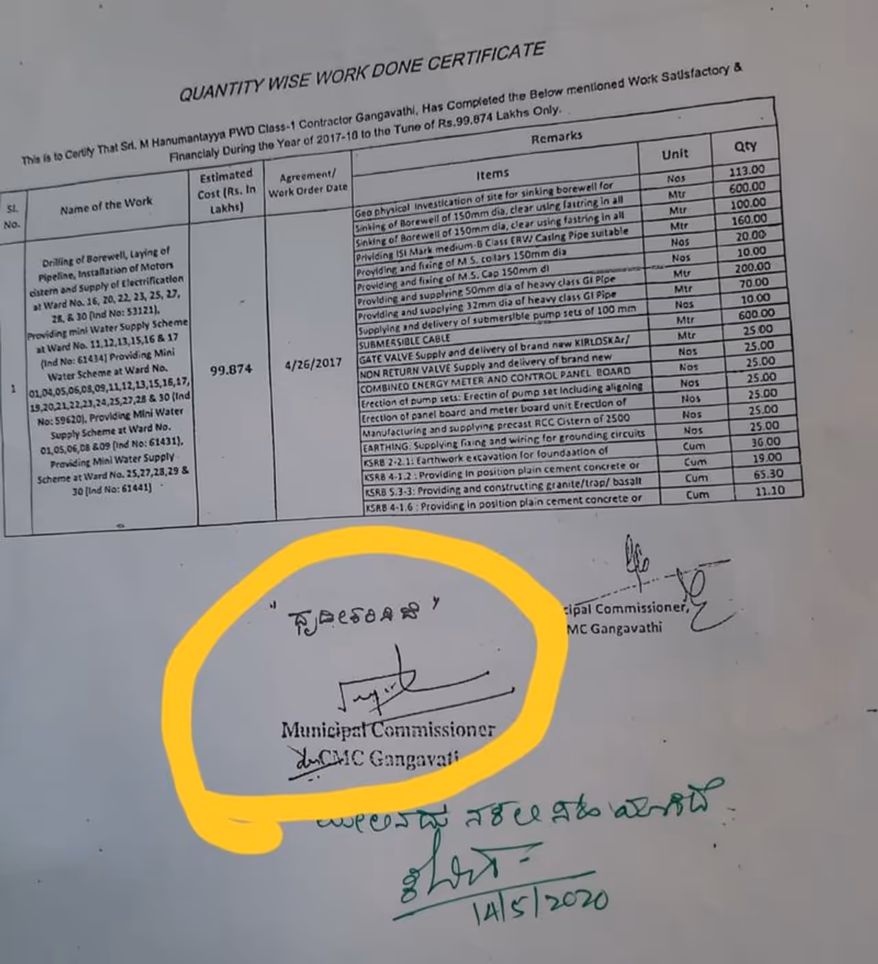 ರಾಯಚೂರು ಜಿಲ್ಲೆಯ ಸಿಂಧನೂರು ತಾಲೂಕಿನಲ್ಲಿ ತುಂಗಭದ್ರಾ ಎಡದಂಡೆ ಕಾಲುವೆಯ ಕಾಮಗಾರಿಯ ಗುತ್ತಿಗೆ ಪಡೆಯುವುದಕ್ಕಾಗಿ ಗುತ್ತಿಗೆದಾರ ಮೀಟಾಯಿಗಾರ ಹನುಮಂತಯ್ಯ(ಅಂಜಿ) ಎಂಬುವರು ನಗರ ಸಭೆಯ ಪೌರಾಯುಕ್ತರಿಂದ ಧೃಡಿಕರಣ ಪಡೆಯಬೇಕಾಗಿತ್ತು. ಮೇ.8 ರಂದು ಪೌರಾಯುಕ್ತ ಗಂಗಾಧರ ಅವರ ನಕಲಿ ಸಹಿ ಫೋರ್ಜರಿ ಮಾಡಿ ಕಾಮಗಾರಿ ಪಡೆದಿದ್ದಾರೆ.