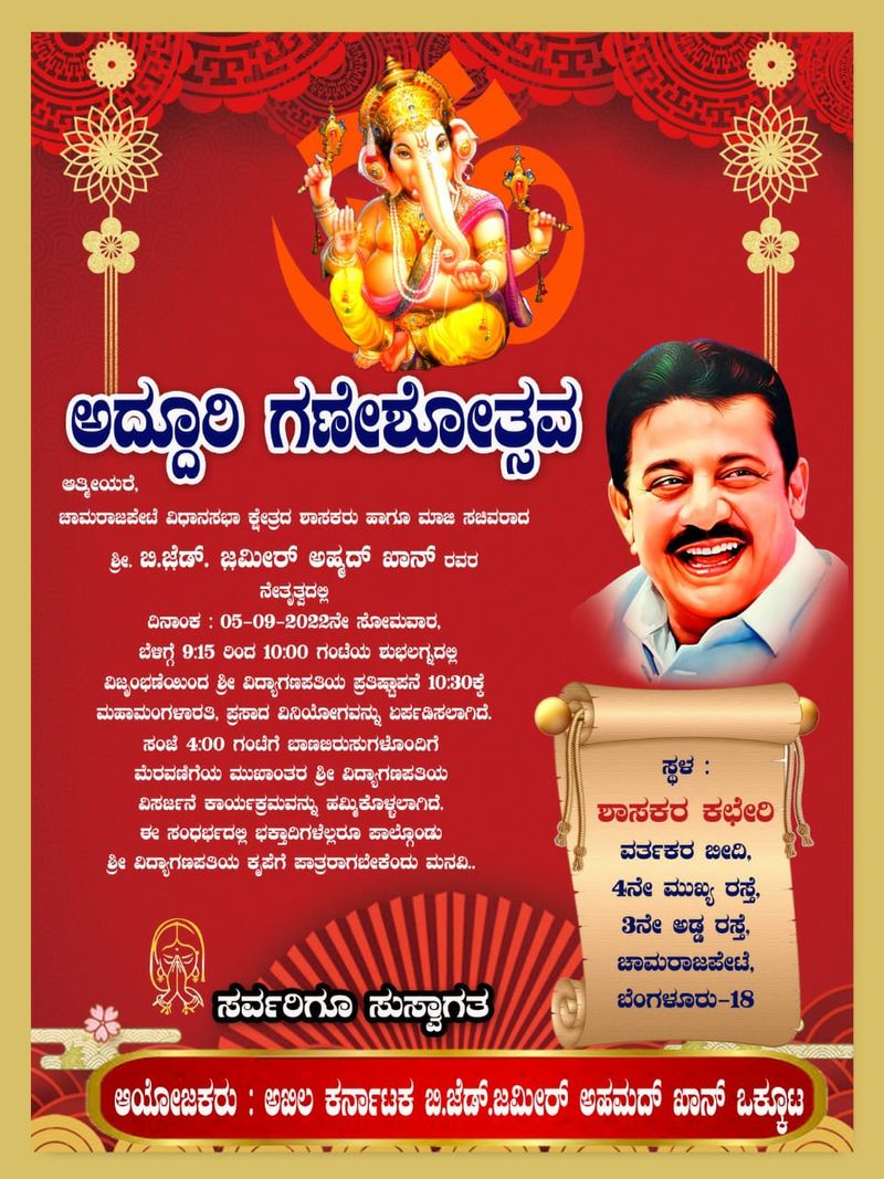 ಚಾಮರಾಜಪೇಟೆಯ ವರ್ತಕರ ಬೀದಿಯಲ್ಲಿರುವ ಶಾಸಕರ ಕಚೇರಿಯಲ್ಲಿ ನಾಳೆ(ಸೋಮವಾರ) ಬೆಳಗ್ಗೆ 9:15 ರಿಂದ 10 ಗಂಟೆಯೊಳಗೆ ಗಣೇಶ ಪ್ರತಿಷ್ಠಾಪನೆಗೆ ತಯಾರಿ ನಡೆಯುತ್ತಿದೆ. ಸಂಜೆ 4 ಗಂಟೆಗೆ ಬಾಣಬಿರುಸುಗಳೊಂದಿಗೆ ಅದ್ಧೂರಿ ಮರವಣಿಗೆಗೂ ಸಿದ್ಧತೆ ನಡೆಯುತ್ತಿದೆ. ಅಖಿಲ ಕರ್ನಾಟಕ ಜಿ.ಜೆಡ್ ಜಮೀರ್ ಅಹ್ಮದ್ ಖಾನ್ ಒಕ್ಕೂಟದಿಂದ ಗಣೇಶೋತ್ಸವ ಆಚರಣೆಗೆ ನಿರ್ಧರಿಸಲಾಗಿದೆ.