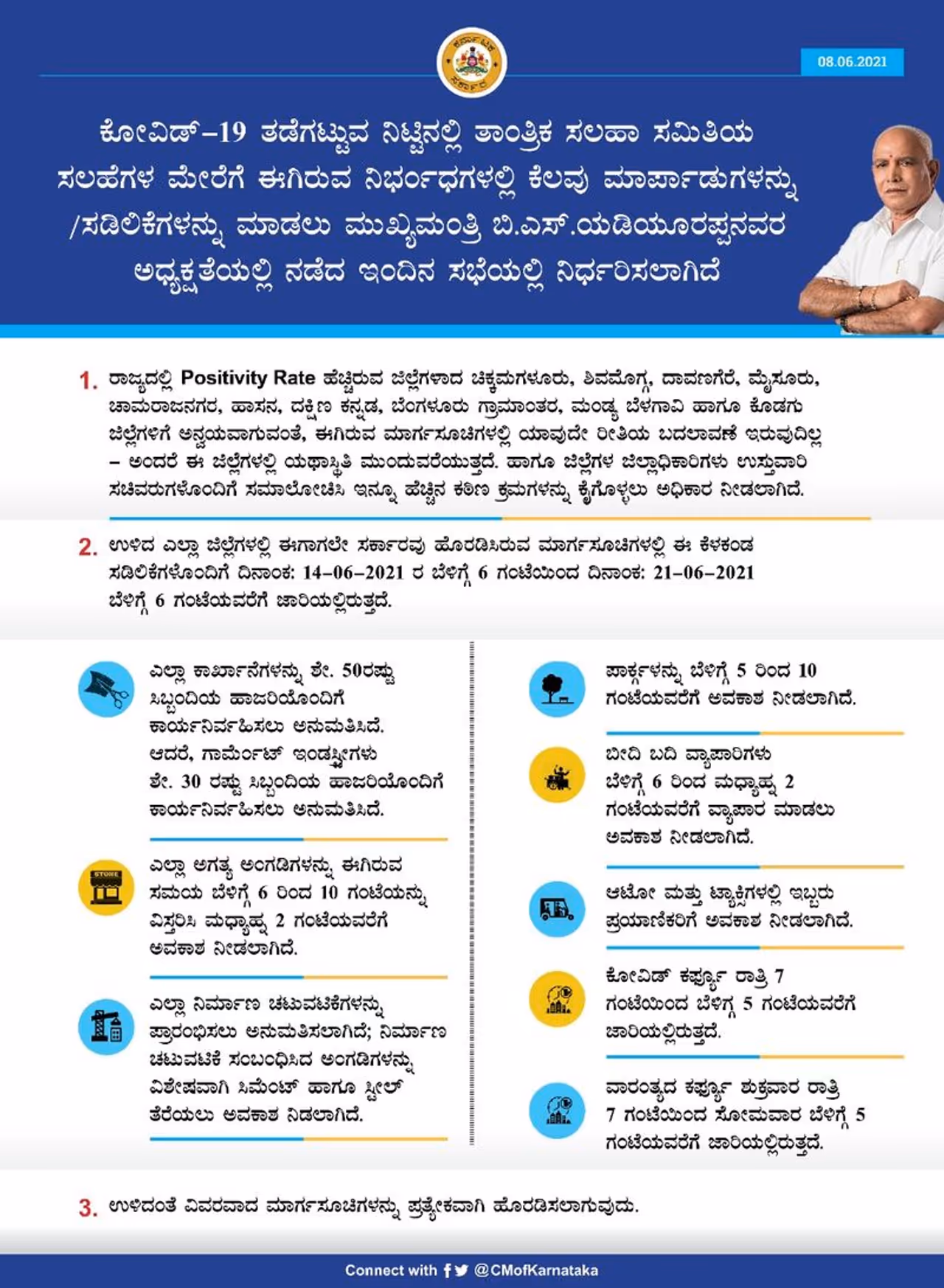 * ಹನ್ನೊಂದು ಜಿಲ್ಲೆಗಳಲ್ಲಿ ಇನ್ನೊಂದು ವಾರ ಲಾಕ್ ಡೌನ್* ಜೂ. 14 ರಿಂದ 19 ಜಿಲ್ಲೆಗಳು ಅನ್ ಲಾಕ್* ಆಟೋ, ಕ್ಯಾಬ್ ಸಂಚಾರಕ್ಕೆ ಅನುಮತಿ* ಬಸ್ ಸಂಚಾರ ಆರಂಭ ಇಲ್ಲ