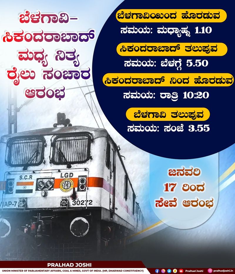 ಬೆಳಗಾವಿ(ಜ.17): ಬಹು ಬೇಡಿಕೆಯ ಬೆಳಗಾವಿಯಿಂದ ಸಿಕಂದರಾಬಾದ್ ನಿತ್ಯ ರೈಲ್ವೇ ಸಂಚಾರ ಇಂದಿನಿಂದ(ಮಂಗಳವಾರ) ಆರಂಭವಾಗಿದೆ. ರೈಲ್ವೇ ಸೇವೆ ಆರಂಭಿಸಿದ್ದಕ್ಕೆ ಕೇಂದ್ರ ಸಂಸದೀಯ ವ್ಯವಹಾರಗಳ ಸಚಿವ ಪ್ರಲ್ಹಾದ್ ಜೋಶಿ ಕೇಂದ್ರ ರೈಲ್ವೇ ಸಚಿವ ಅಶ್ವಿನಿ ವೈಷ್ಣವ್ ಅವರಿಗೆ ಧನ್ಯವಾದ ತಿಳಿಸಿದ್ದಾರೆ.