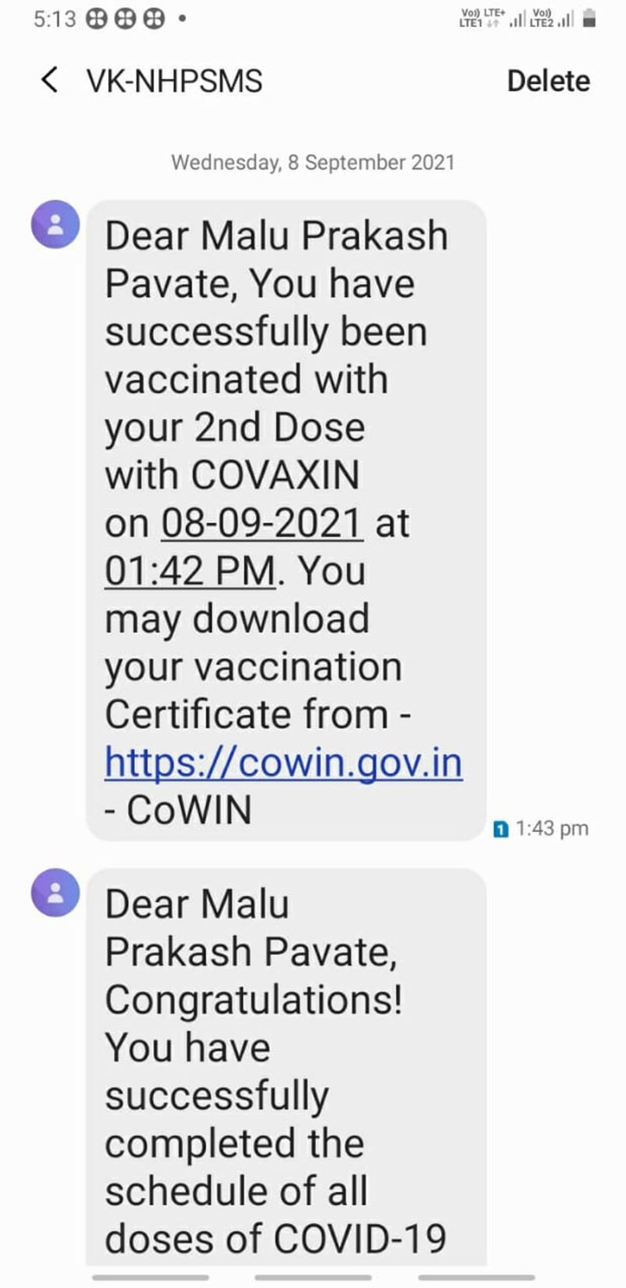 ಏಪ್ರಿಲ್ 28 ರಂದು ಮೃತಪಟ್ಟಿರುವ ಮಾಲಾ ಪಾವಟೆ ಅವರಿಗೆ ಎರಡನೇ ದೋಸ್ ಲಸಿಕೆ ಪಡೆದ ಬಗ್ಗೆ ಕುಟುಂಬಸ್ಥರ ಮೊಬೈಲ್ಗೆ ಮೆಸೇಜ್ ಬಂದಿರೋದು ಅಚ್ಚರಿಗೆ ಕಾರಣವಾಗಿದೆ. ಸೆ. 08 ರಂದು ಎರಡನೇ ಡೋಸ್ ಲಸಿಕೆ ಪಡೆದ ಬಗ್ಗೆ ಮೆಸೇಜ್ ಬಂದಿದೆ. ಮಾಲಾ ಪಾವಟೆ ಮೃತಪಡುವ ಮೊದಲು ಮೊದಲ ಕೋವಿಡ್ ಡೋಸ್ ಲಸಿಕೆ ಪಡೆದಿದ್ದರು.