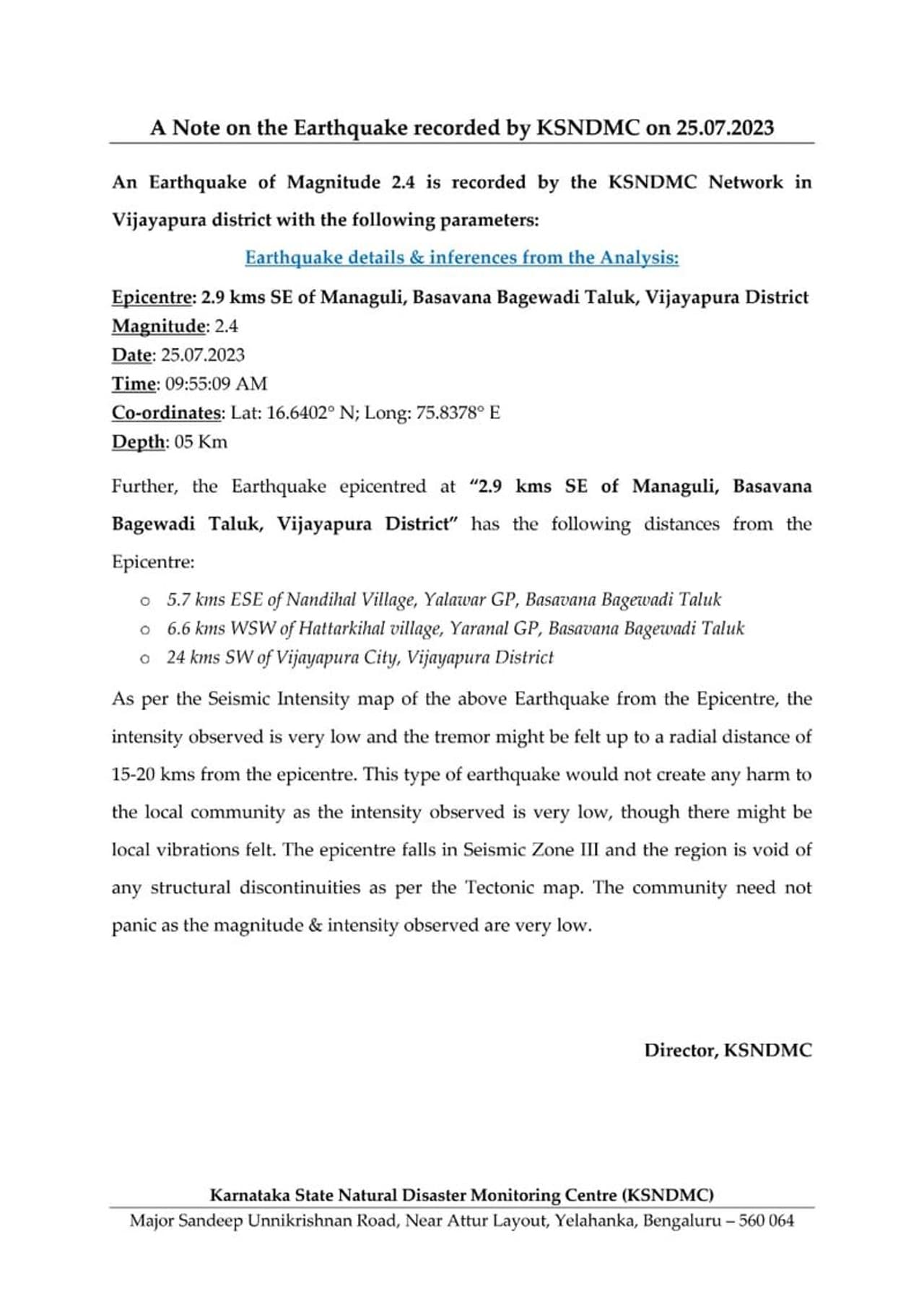 ಇಂದು ಬೆಳಿಗ್ಗೆ 9-55ಕ್ಕೆ ಭೂಕಂಪನದ ಸಂಭವಿಸಿದೆ. ರಿಕ್ಟರ್ ಮಾಪಕದಲ್ಲಿ 2.4 ಭೂಕಂಪನ ದಾಖಲಾಗಿದೆ.