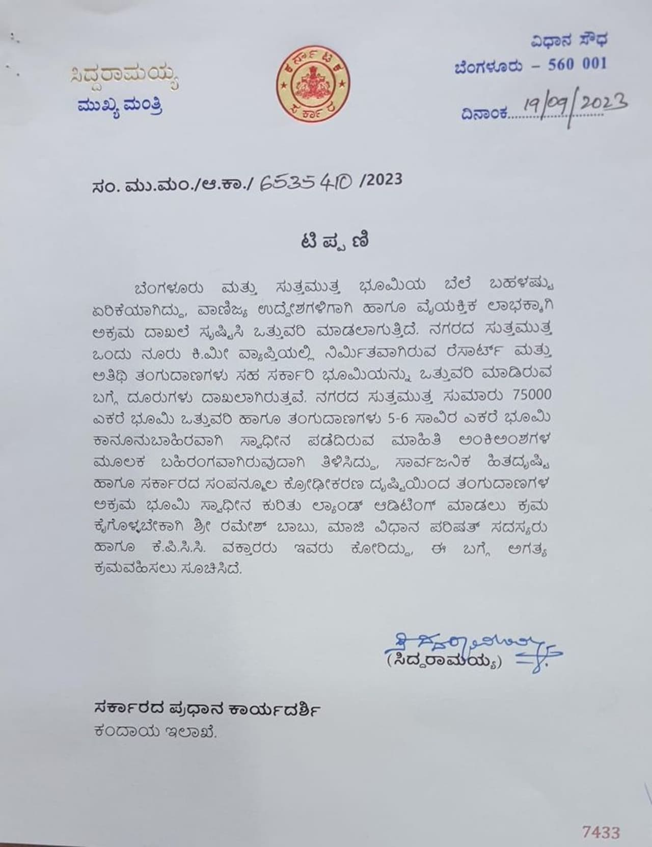 ಸಿಲಿಕಾನ್ ಸಿಟಿ ಬೆಂಗಳೂರಿನ ಸುತ್ತಲಿನ ಪ್ರದೇಶದಲ್ಲಿ 75 ಸಾವಿರ ಎಕರೆಯಷ್ಟು ಭೂಮಿಗೆ ನಕಲಿ ದಾಖಲೆಗಳನ್ನು ಸೃಷ್ಟಿಸಿ ಮಾರಾಟ ಮಾಡಲಾಗಿದೆ ತನಿಖೆ ಮಾಡುವಂತೆ ಸಿಎಂ ಸಿದ್ದರಾಮಯ್ಯ ಆದೇಶ ಹೊರಡಿಸಿದ್ದಾರೆ.