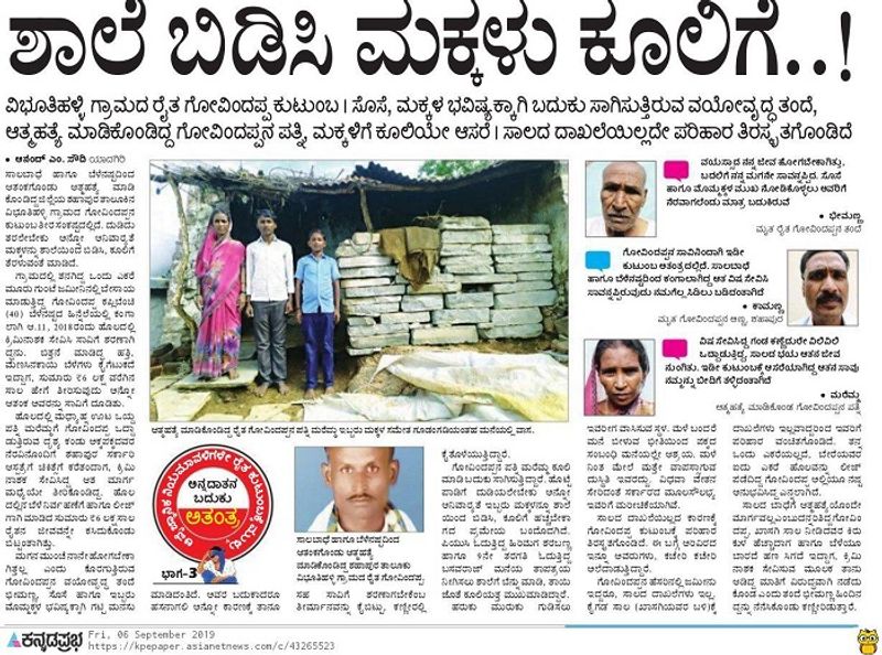 ಯಾದಗಿರಿ [ಸೆ.06]: ಸಾಲಬಾಧೆ ಹಾಗೂ ಬೆಳೆನಷ್ಟದಿಂದ ಆತಂಕಗೊಂಡು ಆತ್ಮಹತ್ಯೆ ಮಾಡಿಕೊಂಡಿದ್ದ ಜಿಲ್ಲೆಯ ಶಹಾಪುರ ತಾಲೂಕಿನ ವಿಭೂತಿಹಳ್ಳಿ ಗ್ರಾಮದ ಗೋವಿಂದಪ್ಪನ ಕುಟುಂಬ ತೀರ ಸಂಕಷ್ಟದಲ್ಲಿದೆ. ದುಡಿದು ತರಲೇಬೇಕು ಅನ್ನೋ ಅನಿವಾರ್ಯತೆ ಮಕ್ಕಳನ್ನು ಶಾಲೆಯಿಂದ ಬಿಡಿಸಿ, ಕೂಲಿಗೆ ತೆರಳುವಂತೆ ಮಾಡಿದೆ.