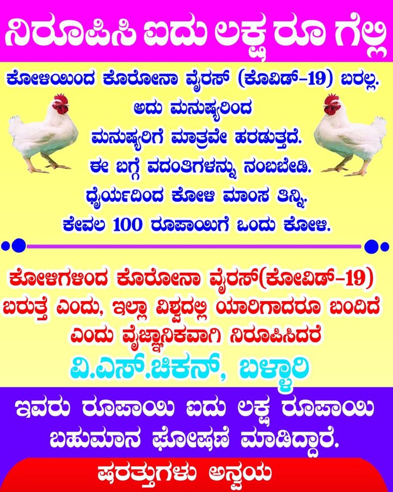 ಕೋಳಿಗಳಿಂದ ಕೊರೋನಾ ವೈರಸ್ ಹರಡಲಿದೆ ವದಂತಿ| ಕೋಳಿಗಳ ಮಾರಾಟದಲ್ಲಿ ತೀವ್ರ ಕುಸಿತ| ಕುಕ್ಕಟೋಧ್ಯಮಕ್ಕೆ ಪೆಟ್ಟು| ಕೋಳಿಯಿಂದ ವೈರಸ್ ಹರಡುತ್ತಿರುವುದು ಸಾಬೀತುಪಡಿಸಿದರೆ 5 ಲಕ್ಷ ಬಹುಮಾನ|