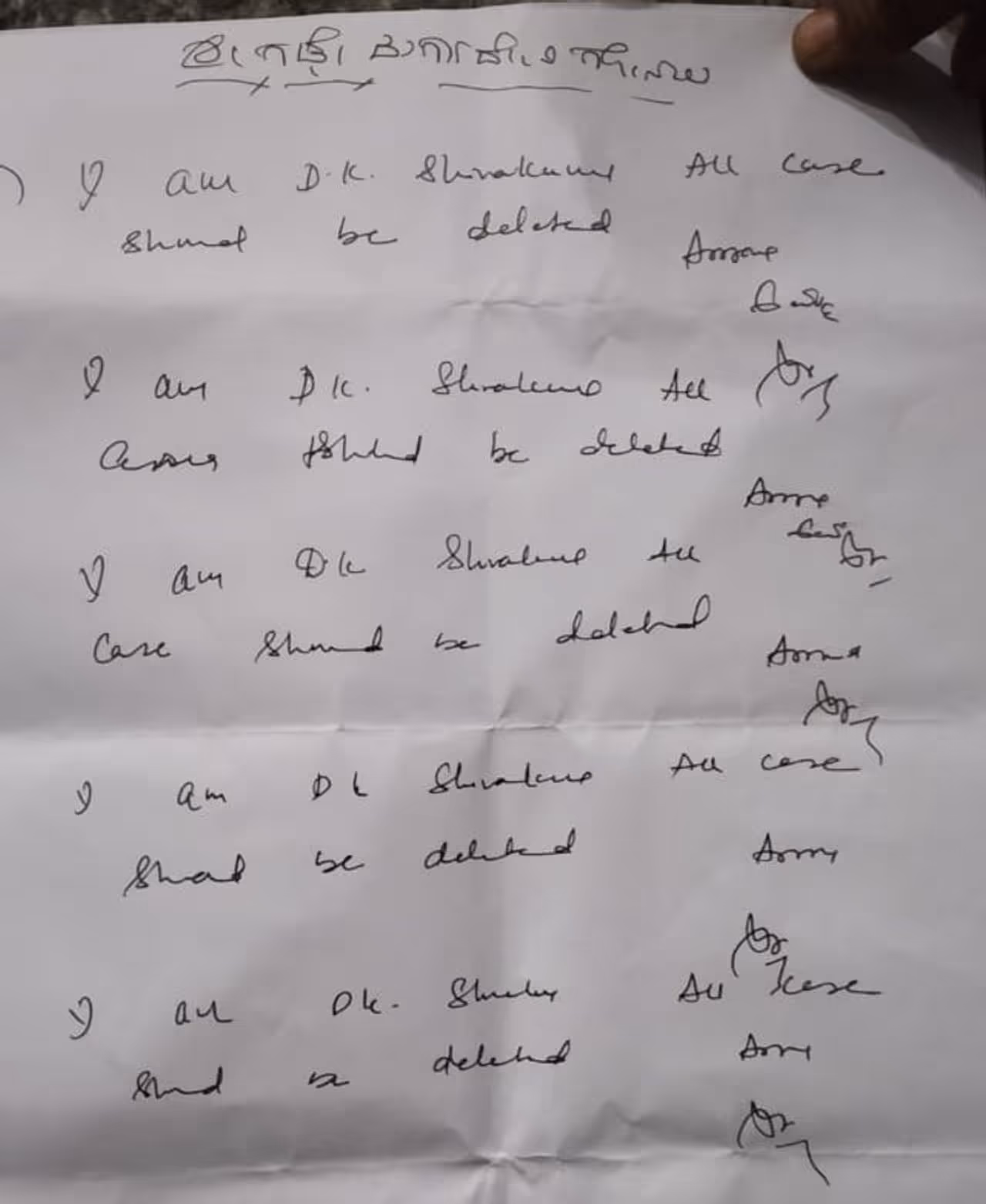 ಗಡೇ ದುರ್ಗಾದೇವಿ ಅರ್ಚಕರಿಗೆ ಪತ್ರ ಕಳುಹಿಸಿಕೊಟ್ಟಿರುವ ಡಿ. ಕೆ. ಶಿವಕುಮಾರ್ ಅವರು, ಕೇಸ್ ನಿಂದ ಮುಕ್ತಿ ಸಿಗುವಂತೆ ದೇವಿಗೆ ಮೊರೆ ಹೋಗಿದ್ದಾರೆ. ಆಲ್ ಕೇಸ್ ಶುಡ್ ಡಿಲೀಟ್ ಎಂದು ತಮ್ಮ ಹಸ್ತಾಕ್ಷರದಲ್ಲೇ ಬರೆದಿರುವ ಪತ್ರವನ್ನ ರವಾನಿಸಿದ್ದಾರೆ.
