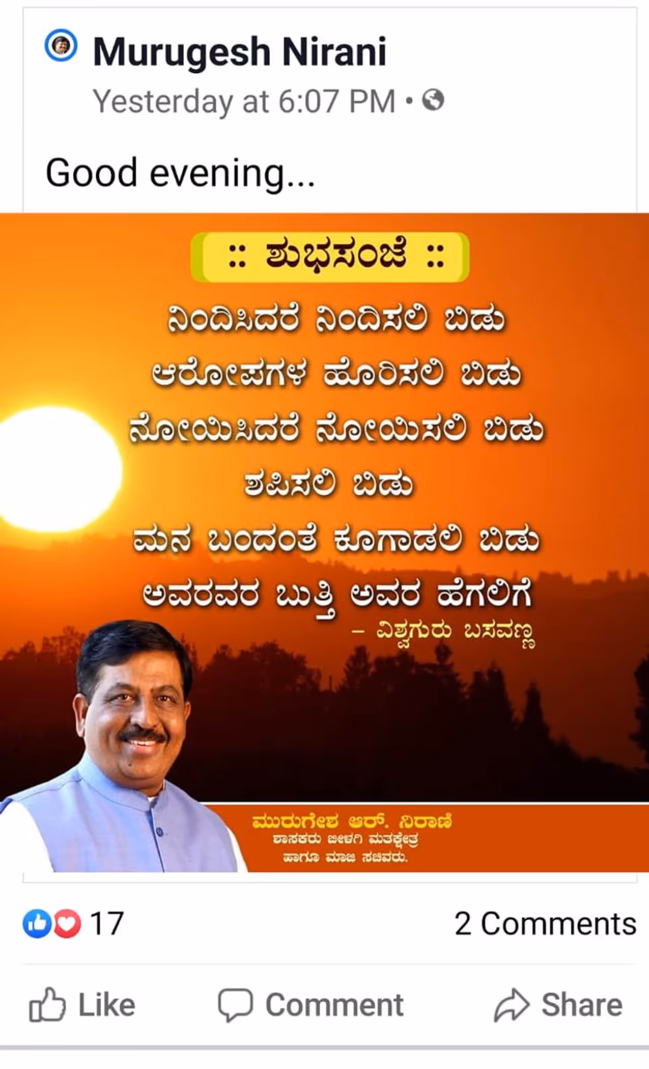 ಹೌದು, ಬಸವಣ್ಣನವರ ವಚನ ಮೂಲಕ ಮುರುಗೇಶ್ ನಿರಾಣಿ ಯತ್ನಾಳ್ಗೆ ಟಾಂಗ್ ಕೊಟ್ಟಿದ್ದಾರಾ ಎಂಬ ಅನುಮಾನ ವ್ಯಕ್ತವಾಗಿದೆ. ಮುರುಗೇಶ್ ನಿರಾಣಿ ತಮ್ಮ ಸಾಮಾಜಿಕ ಜಾಲತಾಣ ಫೇಸ್ಬುಕ್ನಲ್ಲಿ ಬಸವಣ್ಣನವರ ವಚನ ಉಲ್ಲೇಖಿಸಿ ಬರೆದುಕೊಂಡು ಪರೋಕ್ಷವಾಗಿ ಯತ್ನಾಳ್ಗೆ ತಿರುಗೇಟು ನೀಡಿದ್ದಾರೆ.