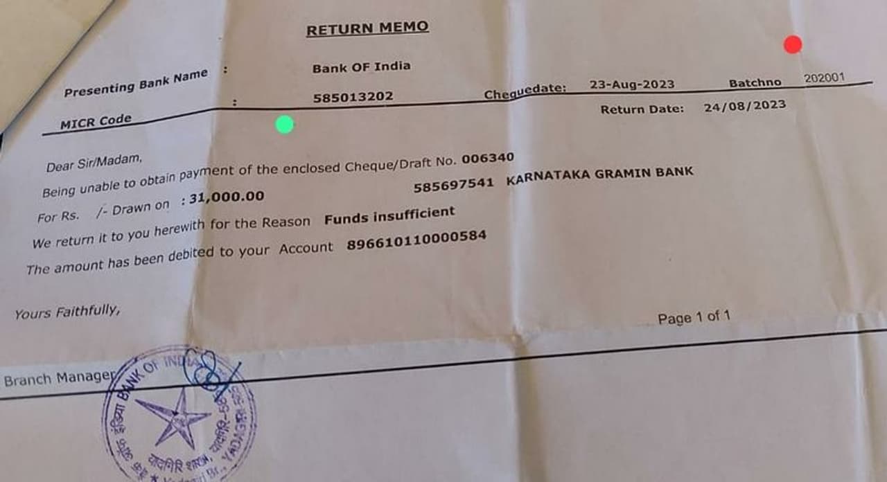 ಯಾದಗಿರಿ ಜಿಲ್ಲೆಯ ವಡಗೇರಾ ತಾಲೂಕಿನ ಗುರುಸುಣಗಿ (ಗುಲಸರಂ) ಗ್ರಾಮದ ಪಂಚಾಯಿತಿ ಅಭಿವೃದ್ಧಿ ಅಧಿಕಾರಿ ನೀಡಿದ್ದ 31 ಸಾವಿರ ರು, ಚೆಕ್ ‘ಫಂಡ್ಸ್ ಇನ್ಸಫೀಷಿಯೆಂಟ್’ ಕಾರಣದಿಂದಾಗಿ ಗ್ರಂಥಾಲಯ ಹಾಗೂ ಮಾಹಿತಿ ಕೇಂದ್ರದ ಮೇಲ್ವಿಚಾರಕ ಬನದಪ್ಪ ಎಂಬುವರಿಗೆ ಬ್ಯಾಂಕಿನಿಂದ “ರಿಟರ್ನ್ ಮೆಮೋ’ ಬಂದಿದೆ.