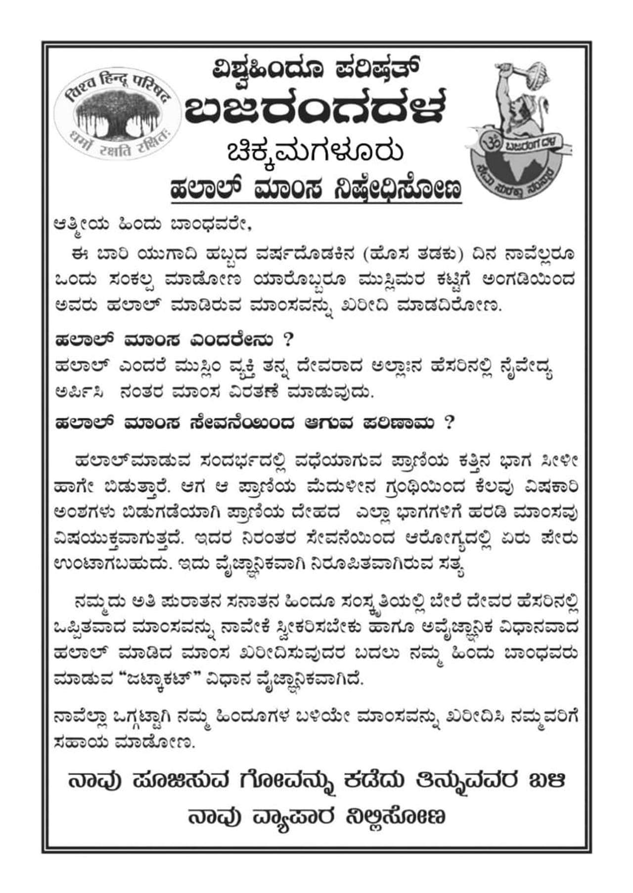 ಹಲಾಲ್ ಬ್ಯಾನ್ ಅಭಿಯಾನದಲ್ಲಿ ನಾವು ಪೂಜಿಸುವ ಗೋವನ್ನ(Cow) ಕಡಿದು ತಿನ್ನುವವರ ಬಳಿ ವ್ಯಾಪರ ನಿಲ್ಲಿಸೋಣ ಎಂದು ವಿಶ್ವಹಿಂದೂ ಪರಿಷತ್ ಬಜರಂಗದಳ ಕರೆ ನೀಡಿದೆ. ಸಂಘ ಪರಿಹಾರದ ಹೆಸರಿನಲ್ಲಿ ಬಿಡುಗಡೆ ಆಗಿರುವ ಕರಪತ್ರ ದಲ್ಲಿಹಿಂದೂಗಳು ಜಟ್ಕಾಕಟ್ ವಿಧಾನ ವೈಜ್ಞಾನಿಕವಾಗಿದೆ. ಹಲಾಲ್ ಮಾಂಸ ಎಂದರೇನು?. ಹಲಾಲ್ ಮಾಂಸ ಸೇವನೆಯಿಂದ ಅಗುವ ಪರಿಣಾಮದ ಬಗ್ಗೆ ಪ್ರಿಂಟ್ ಮಾಡಲಾಗಿದೆ. ಒಟ್ಟಾರೆ ಕಾಫಿನಾಡು ಚಿಕ್ಕಮಗಳೂರು ಜಿಲ್ಲೆಯಲ್ಲಿ ಹಿಜಾಬ್ ವಿವಾದದಿಂದ ಉಂಟಾಗಿರುವ ವ್ಯಾಪಾರ ಸಂಘರ್ಷದ ಪರಿಣಾಮ ದಿನದಿಂದ ದಿನಕ್ಕೆ ಕಾವು ಪಡೆಯುತ್ತಿದೆ. ಇದರ ನಡುವೆ ಈಗ ಯುಗಾದಿ ಹಬ್ಬದ ಮರುದಿನ ನಡೆಯುವಂತಹ ಹಬ್ಬದ ಮೇಲೆ ಪರಿಣಾಮ ಬೀರಿದೆ. ಹಲಾಲ್ ಕಟ್ ಅಭಿಯಾನ ದಿನದಿಂದ ದಿನಕ್ಕೆ ಕಾವು ಪಡೆದು ಲಕ್ಷಣ ಗೋಚರವಾಗುತ್ತಿದೆ.