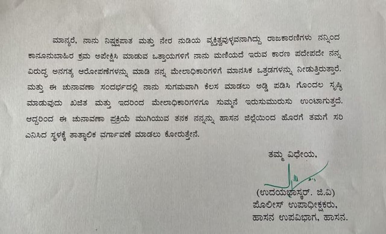 ನಾನು ನಿಷ್ಪಕ್ಷಪಾತ, ನೇರ ನುಡಿಯ ವ್ಯಕ್ತಿತ್ವವುಳ್ಳವನಾಗಿದ್ದೇನೆ. ರಾಜಕಾರಣಿಗಳು ನನ್ನಿಂದ ಕಾನೂನು ಬಾಹಿರ ಕ್ರಮ ಆಪೇಕ್ಷಿಸುತ್ತಿದ್ದಾರೆ. ಅವರ ಒತ್ತಾಯಗಳಿಗೆ ನಾನು ಮಣಿಯದ ಕಾರಣ ನನ್ನ ವಿರುದ್ಧ ಅನಗತ್ಯ ಆರೋಪಗಳನ್ನು ಮಾಡುತ್ತಿದ್ದಾರೆ. ನನ್ನ ಮೇಲಾಧಿಕಾರಿಗಳಿಗೆ ಮಾನಸಿಕ ಒತ್ತಡಗಳನ್ನು ನೀಡುತ್ತಿದ್ದಾರೆ. ರಾಜಕಾರಣಿಗಳು ಈ ಚುನಾವಣಾ ಸಂದರ್ಭದಲ್ಲಿ ನಾನು ಸುಗಮವಾಗಿ ಕೆಲಸ ಮಾಡಲು ಅಡ್ಡಿಪಡಿಸಿ ಗೊಂದಲ ಸೃಷ್ಟಿಪಡಿಸುವುದು ಖಚಿತ. ಇದರಿಂದ ಮೇಲಾಧಿಕಾರಿಗಳಿಗೂ ಇರುಸುಮುರುಸು ಉಂಟಾಗುತ್ತದೆ. ಹೀಗಾಗಿ ಚುನಾವಣಾ ಪ್ರಕ್ರಿಯೆ ಮುಗಿಯುವ ತನಕ ನನ್ನನ್ನು ಹಾಸನ ಜಿಲ್ಲೆಯಿಂದ ತಮಗೆ ಸರಿ ಎನಿಸಿದ ಸ್ಥಳಕ್ಕೆ ತಾತ್ಕಾಲಿಕ ವರ್ಗಾವಣೆಗೆ ಕೋರುತ್ತೇನೆ ಅಂತ ಉದಯ್ ಭಾಸ್ಕರ್ ಪತ್ರದಲ್ಲಿ ಉಲ್ಲೇಖಿಸಿದ್ದಾರೆ.