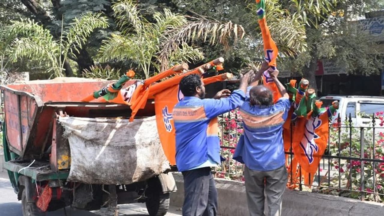 ಬಿಜೆಪಿ ಸಮಾರಂಭ ಇನ್ನೂ ಮುಗಿಯೋ ಮೊದಲೇ ಪಾಲಿಕೆ ಏಕಾಕಿ ಎಚ್ಚೆತ್ತವರಂತೆ ರಸ್ತೆಗೆ ಬಿಗಿಯಲಾಗಿದ್ದ ಬಾವುಟಗಳನ್ನೆಲ್ಲ ತೆಗೆದು ಕಸದ ವಾಹನಗಳಲ್ಲಿ ಹಾಕುವ ಮೂಲಕ ಇಡೀ ನಗರವನ್ನ ಸ್ವಚ್ಚ ಮಾಡಿತು.
