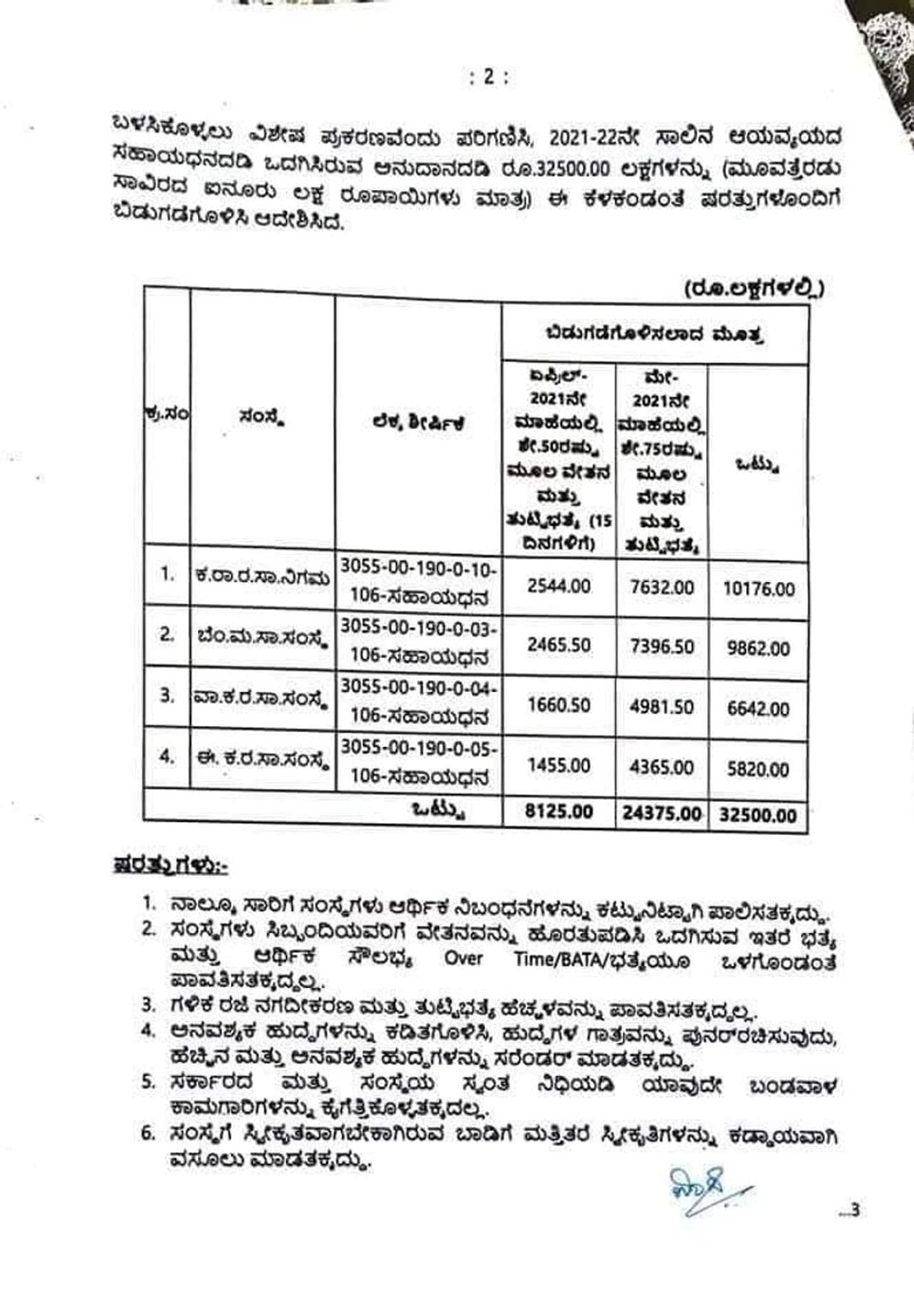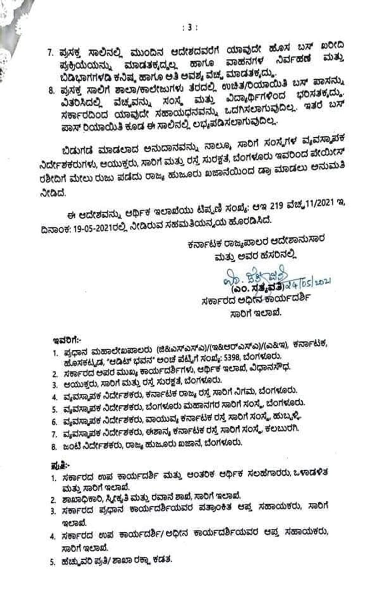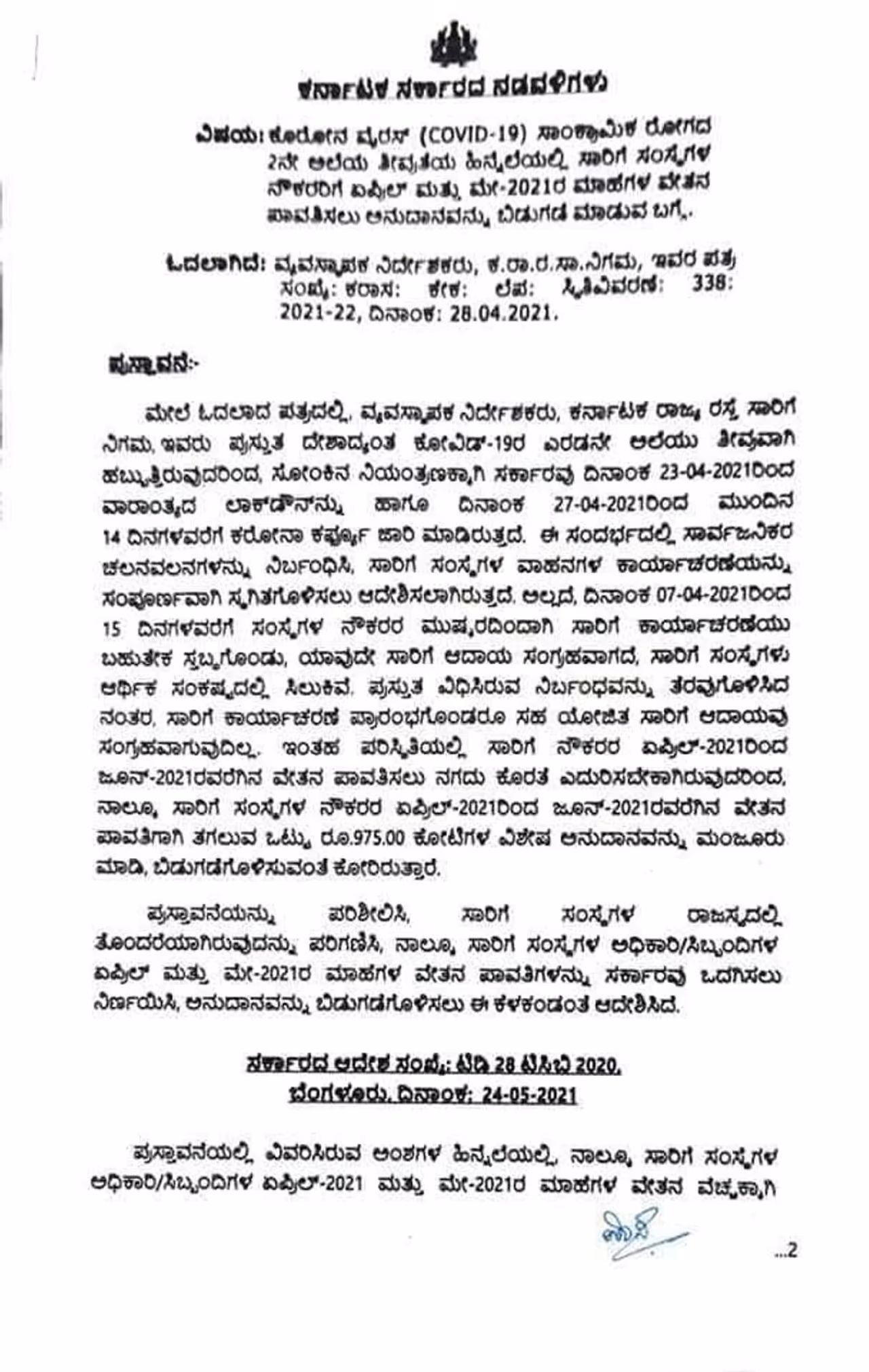 ಏಪ್ರಿಲ್ ಮತ್ತು ಮೇ ತಿಂಗಳ ಸಂಬಳ ಬಿಡುಗಡೆ ಮಾಡಿದೆ. ರಾಜ್ಯ ಸಾರಿಗೆ ನಿಗಮಗಳಿಗೆ 325 ಕೋಟಿ ರೂ. ಬಿಡುಗಡೆ ಮಾಡಿದೆ. ವಿಶೇಷ ಪ್ರಕರಣ ಅಂತ ಪರಿಗಣಿಸಿ ಸಾರಿಗೆ ನಿಗಮಗಳಿಗೆ ಅನುದಾನ ನೀಡಿದೆ. ಜತೆಗೆ ಕೆಲವೊಂದು ನಿಯಮಾವಳಿಗಳನ್ನು ಸ್ಪಷ್ಟಪಡಿಸಿದೆ.