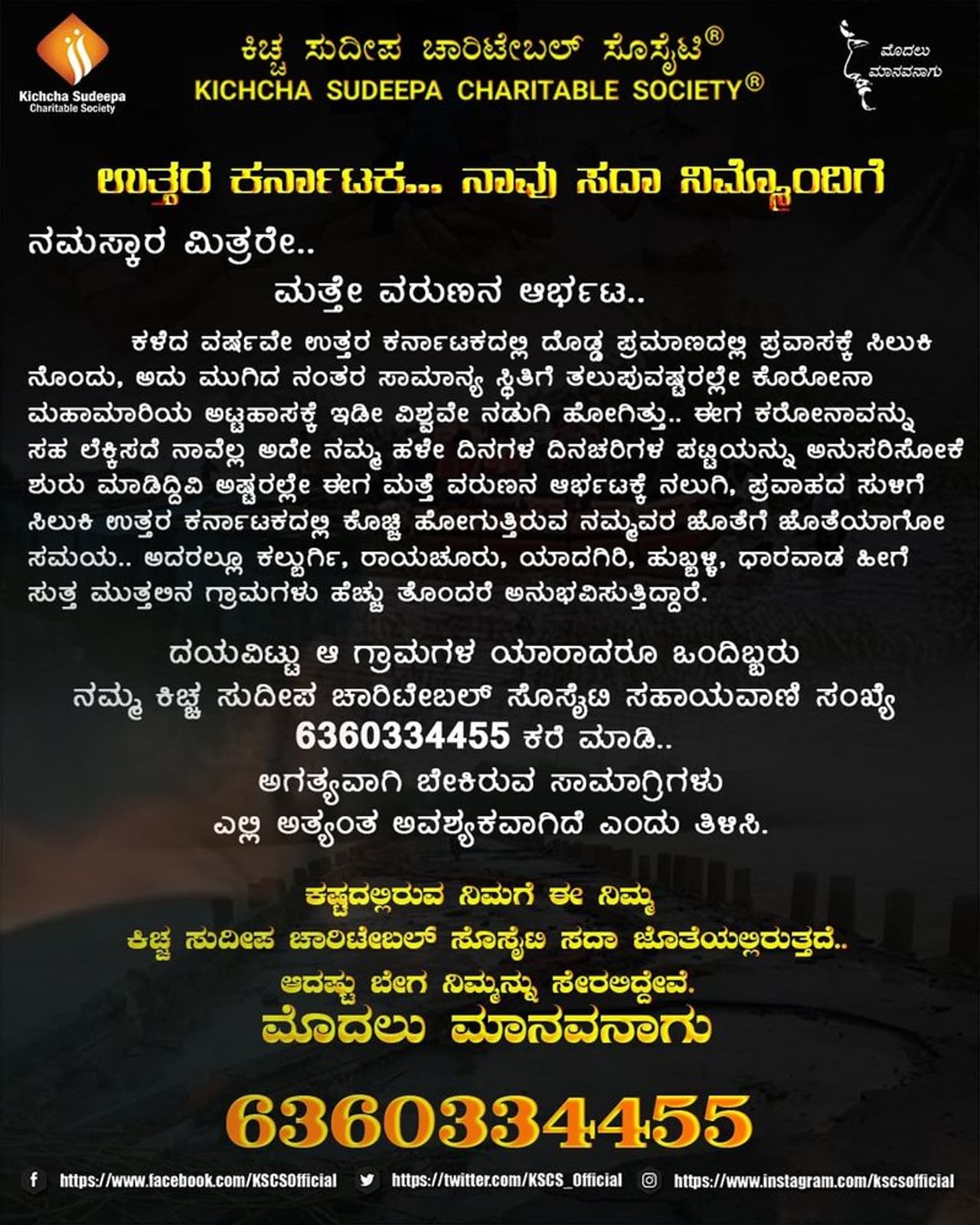 ಉತ್ತರ ಕರ್ನಾಟಕದಲ್ಲಿ ಜಲಪ್ರವಾಹ/ ನೆರವಿಗೆ ಧಾವಿಸಿದ ಕಿಚ್ಚ ಸುದೀಪ್ ಚಾರಿಟಬಲ್ ಸೊಸೈಟಿ/ ನೆರವು ನೀಡಲು ಸಹಾಯವಾಣಿ/ ಹುಬ್ಬಳ್ಳಿ, ಯಾದಗಿರಿ, ಕಲ್ಬುರ್ಗಿ ಜನರಿಗಾಗಿ ಸಹಾಯವಾಣಿ