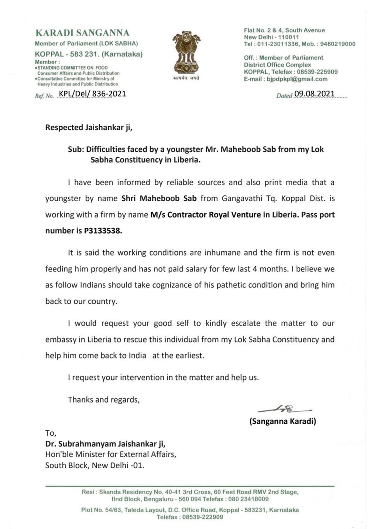 * ಲಿಬೇರಿಯಾ ದೇಶದಲ್ಲಿ ಸಂಕಷ್ಟಕ್ಕೆ ಸಿಲುಕಿರುವ ಗಂಗಾವತಿ ಯುವಕ* ವಿದೇಶಾಂಗ ಸಚಿವರಿಗೆ ಪತ್ರ ಬರೆದಿರುವ ಸಂಸದರು* ಕೂಡಲೇ ಆತನಿಗೆ ಸಹಾಯ ಹಸ್ತ ಚಾಚುವಂತೆ ಮನವಿ