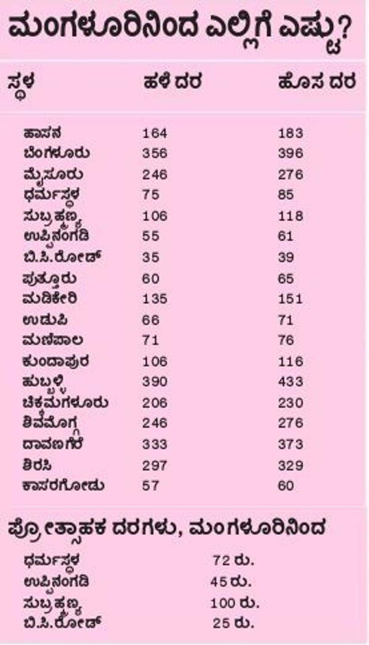 ಉಡುಪಿ- 66- 71, ಮಣಿಪಾಲ- 71- 76, ಕುಂದಾಪುರ- 106- 116, ಹುಬ್ಬಳ್ಳಿ- 390- 433, ಚಿಕ್ಕಮಗಳೂರು- 206- 230, ಶಿವಮೊಗ್ಗ- 246- 276, ದಾವಣಗೆರೆ- 333- 373, ಶಿರಸಿ- 297- 329, ಕಾಸರಗೋಡು- 57- 60, ಪ್ರೋತ್ಸಾಹಕ ದರಗಳು, ಮಂಗಳೂರಿನಿಂದ ಧರ್ಮಸ್ಥಳ- 72 ರು, ಉಪ್ಪಿನಂಗಡಿ- 45 ರು, ಸುಬ್ರಹ್ಮಣ್ಯ- 100 ರು.., ಬಿ.ಸಿ.ರೋಡ್- 25 ರು.
