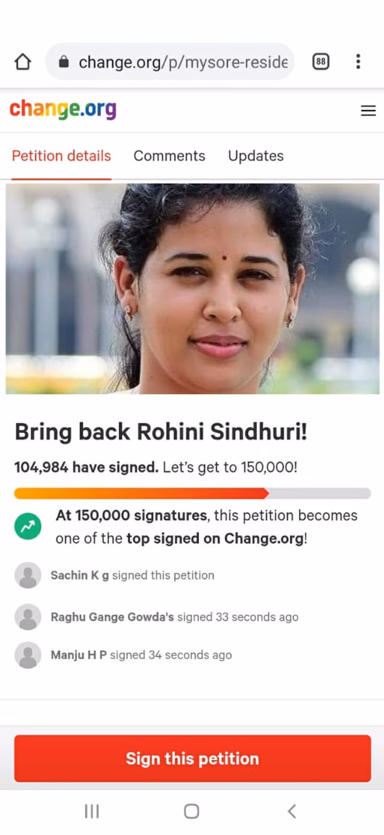 Change.org ಸಂಸ್ಥೆಯಿಂದ ಬ್ರಿಂಗ್ ಬ್ಯಾಕ್ ರೋಹಿಣಿ ಸಿಂಧೂರಿ ಅಭಿಯಾನ ಆರಂಭವಾಗಿದ್ದು ಈಗಾಗಲೇ ಲಕ್ಷಕ್ಕೂ ಅಧಿಕ ಮಂದಿ ಬೆಂಬಲ ಸೂಚಿಸಿ ಸಹಿ ಮಾಡಿದ್ದಾರೆ.