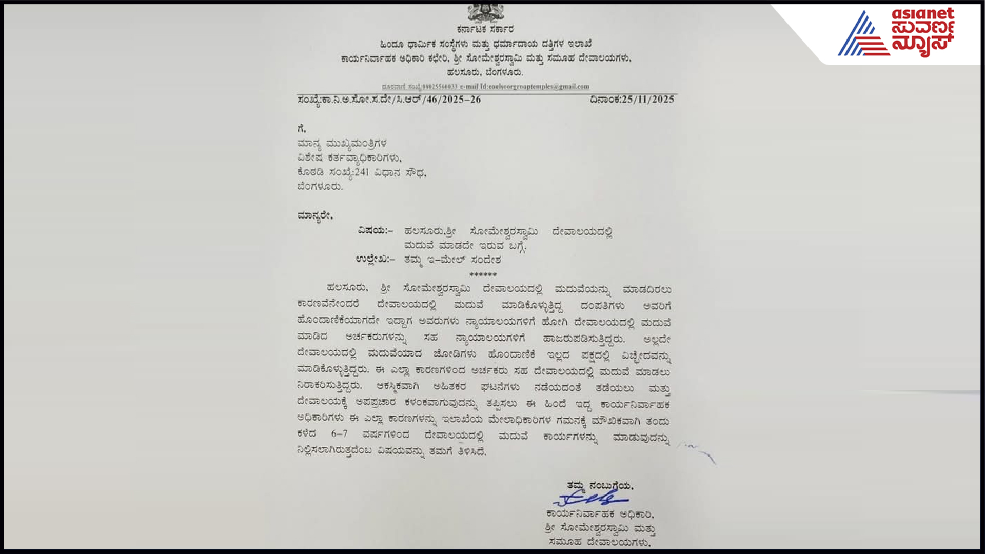 ಇದೇ ಕಾರಣಕ್ಕೆ ಬೆಂಗಳೂರಿನ ಹಲಸೂರಿನ ಸೋಮೇಶ್ವರಸ್ವಾಮಿ ದೇವಾಲಯದಲ್ಲಿ ಆರೇಳು ವರ್ಷಗಳಿಂದ ಮದುವೆಯನ್ನೇ ನಿಲ್ಲಿಸಲಾಗಿದೆ. ಮದುವೆ ನಿಲ್ಲಿಸಿರುವ ಬಗ್ಗೆ ಸರಿಯಾದ ಮಾಹಿತಿ ಇಲ್ಲದೇ ಹಲವರು ಗೊಂದಲಕ್ಕೀಡಾಗಿದ್ದರು. ಇದೀಗ ದೇವಾಲಯದ ಆಡಳಿತ ಮಂಡಳಿ ಈ ಬಗ್ಗೆ ಇದೀಗ ಸ್ಪಷ್ಟನೆ ಕೊಟ್ಟಿದೆ. ದೇವಾಲಯದಲ್ಲಿನ ಅಪಪ್ರಚಾರವನ್ನು ತಪ್ಪಿಸುವ ಸಲುವಾಗಿ ಇಂಥದ್ದೊಂದು ನಿರ್ಧಾರ ತೆಗೆದುಕೊಳ್ಳಲಾಗಿದೆ ಎಂದು ಮುಖ್ಯಮಂತ್ರಿಗಳಿಗೆ ದೇವಾಲಯದ ಆಡಳಿತ ಮಂಡಳಿ ಪತ್ರ ಬರೆದಿದ್ದು ಇದೀಗ ಅದು ಸೋಷಿಯಲ್ ಮೀಡಿಯಾದಲ್ಲಿ ವೈರಲ್ ಆಗಿದೆ.