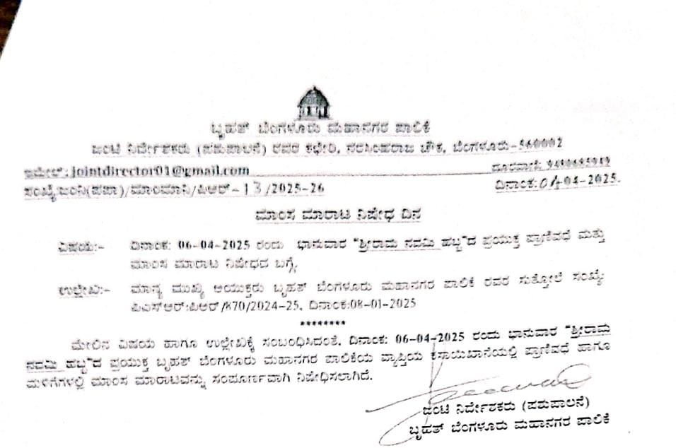 ಬೆಂಗಳೂರು (ಏ.04): ಸಿಲಿಕಾನ್ ಸಿಟಿ ಬೆಂಗಳೂರಿನಲ್ಲಿ ಭಾನುವಾರ ಪ್ರಾಣಿವಧೆ ಹಾಗೂ ಮಾಂಸ ಮಾರಾಟವನ್ನು ನಿಷೇಧಿಸಿ ಬಿಬಿಎಂಪಿ ವತಿಯಿಂದ ಆದೇಶ ಹೊರಡಿಸಲಾಗಿದೆ.