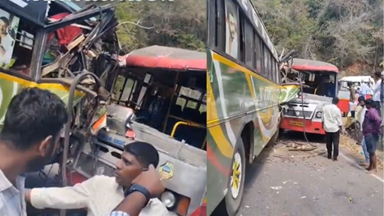 ಚಾಮರಾಜನಗರದ ಮಲೆ ಮಹದೇಶ್ವರ ಬೆಟ್ಟದ ಘಾಟ್ ರಸ್ತೆಯ 7ನೇ ತಿರುವಿನಲ್ಲಿ ಕೆಎಸ್ಆರ್ಟಿಸಿ ಮತ್ತು ಖಾಸಗಿ ಬಸ್ ನಡುವೆ ಮುಖಾಮುಖಿ ಡಿಕ್ಕಿ ಸಂಭವಿಸಿದೆ. ಈ ಭೀಕರ ಅಪಘಾತದಲ್ಲಿ ಚಾಲಕರು ಸೇರಿದಂತೆ ಹತ್ತಕ್ಕೂ ಹೆಚ್ಚು ಪ್ರಯಾಣಿಕರು ಗಂಭೀರವಾಗಿ ಗಾಯಗೊಂಡಿದ್ದು, ಅವರನ್ನು ಆಸ್ಪತ್ರೆಗೆ ದಾಖಲಿಸಲಾಗಿದೆ.