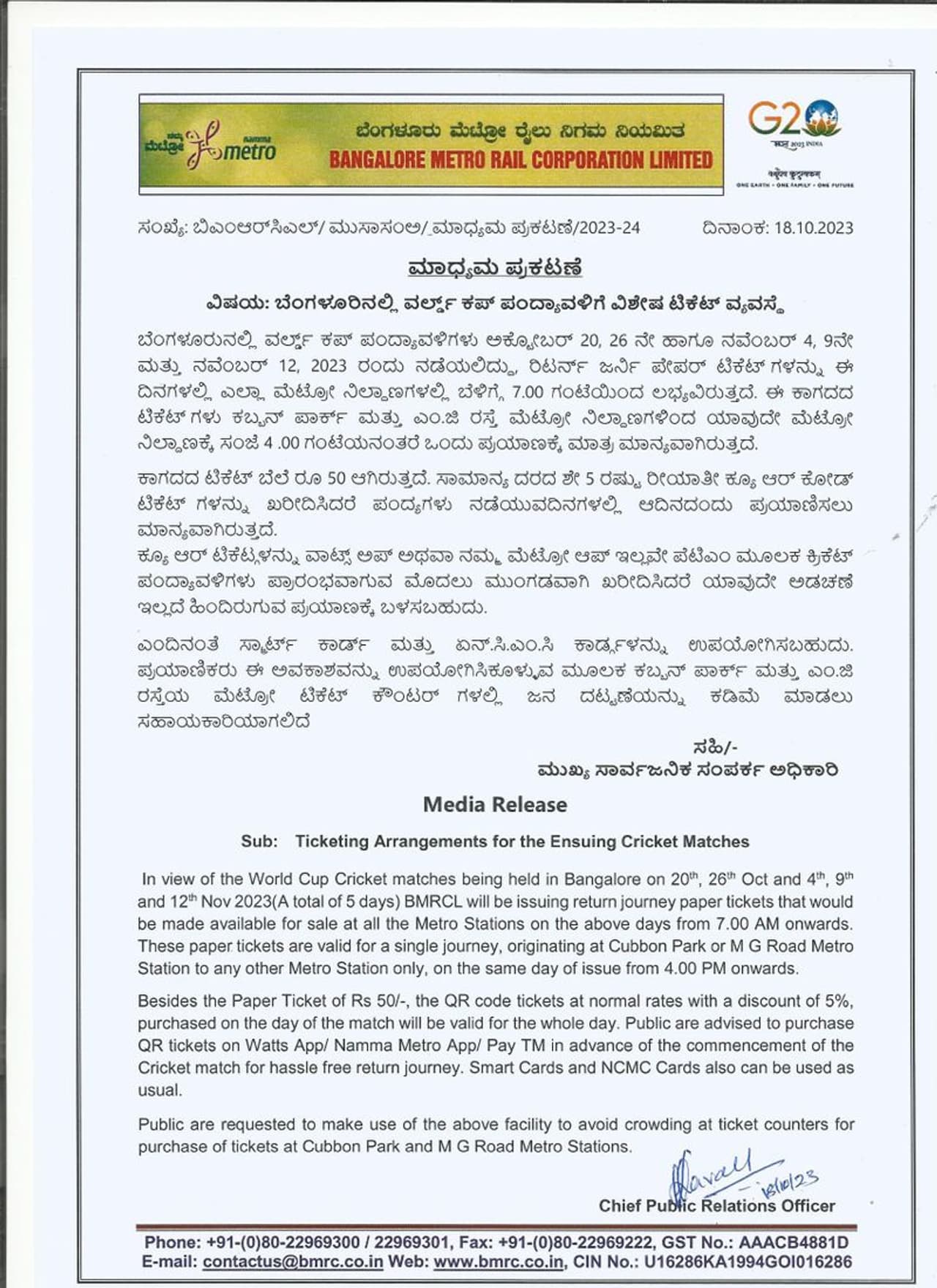 ಬೆಂಗಳೂರಿನಲ್ಲಿ ನಡೆಯುವ ವರ್ಲ್ಡ್ ಕಪ್- 2023 ಪಂದ್ಯಾವಳಿಗೆ ನಮ್ಮ ಮೆಟ್ರೋ ವತಿಯಿಂದ ವಿಶೇಷ ಟಿಕೆಟ್ ವ್ಯವಸ್ಥೆಯನ್ನು ಮಾಡಲಾಗಿದೆ. ಬೆಂಗಳೂರುನಲ್ಲಿ ವರ್ಲ್ಡ್ ಕಪ್ ಪಂದ್ಯಾವಳಿಗಳು ಅಕ್ಟೋಬರ್ 20, 26 ನೇ ಹಾಗೂ ನವೆಂಬರ್ 4, 9ನೇ ಮತ್ತು ನವೆಂಬರ್ 12, 2023 ರಂದು ನಡೆಯಲಿವೆ. ಈ ವೇಳೆ ಪಂದ್ಯ ವೀಕ್ಷಣೆಗೆ ಬರುವ ಕ್ರಿಕೆಟ್ ಪ್ರೇಮಿಗಳಿಗೆ ರಿಟರ್ನ್ ಜರ್ನಿ ಪೇಪರ್ ಟಿಕೆಟ್ ಗಳನ್ನು ಆಯಾ ದಿನಗಳಲ್ಲಿ ಎಲ್ಲಾ ಮೆಟ್ರೋ ನಿಲ್ದಾಣಗಳಲ್ಲಿಯೂ ಬೆಳಗ್ಗೆ 7.00 ಗಂಟೆಯಿಂದ ವಿತರಣೆ ಮಾಡಲಾಗುತ್ತದೆ.