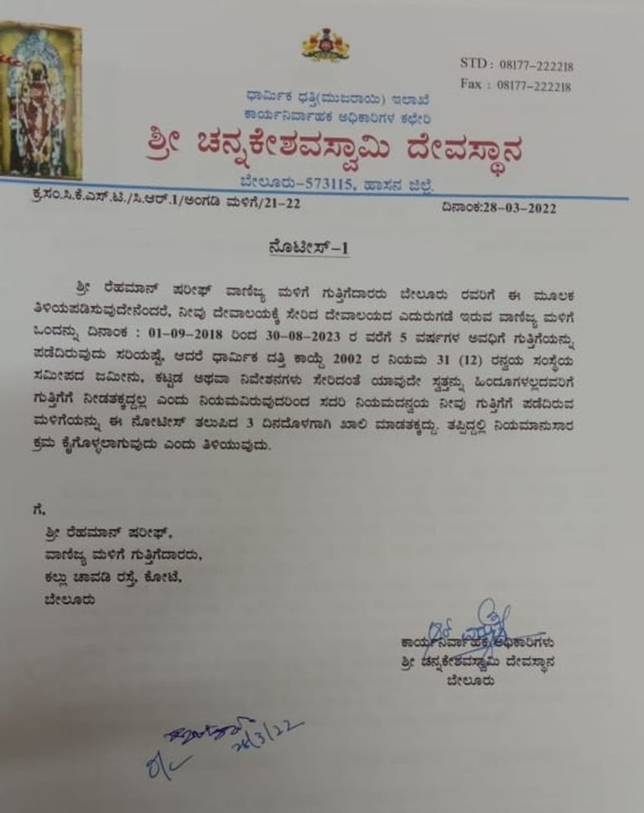 ನೀವು ದೇವಾಲಯಕ್ಕೆ ಸೇರಿದ ವಾಣಿಜ್ಯ ಮಳಿಗೆಯನ್ನು 1-9-2018 ರಿಂದ 30-8-2023 ರವರೆಗೆ ಐದು ವರ್ಷಗಳ ಅವಧಿಗೆ ಗುತ್ತಿಗೆ ಪಡೆದಿರುವುದು ಸರಿ ಅಷ್ಟೇ ಆದರೆ ಧಾರ್ಮಿಕ ದತ್ತಿ ಕಾಯ್ದೆ 2002 ರ ನಿಯಮ 31 (12) ರಿ ಸಂಸ್ಥೆ ಅನ್ವಯದ ಜಮೀನು, ಕಟ್ಟಡಗಳು, ನಿವೇಶನ ಸೇರಿದಂತೆ ಯಾವುದೇ ಸ್ವತ್ತನ್ನು ಹಿಂದುಗಳಲ್ಲದವರಿಗೆ ಗುತ್ತಿಗೆ ನೀಡತಕ್ಕದ್ದಲ್ಲ ನಿಯಮವಿರುವುದರಿಂದ ಸದರಿ ನಿಯಮದನ್ವಯ ನೀವು ಗುತ್ತಿಗೆ ಪಡೆದಿರುವ ಮಳಿಗೆಯನ್ನು ನೋಟೀಸ್ ತಲುಪಿದ ಮೂರು ದಿನದ ಒಳಗೆ ಖಾಲಿ ಮಾಡತಕ್ಕದ್ದು ತಪ್ಪಿದ್ದಲ್ಲಿ ನಿಯಮಾನುಸಾರ ಕ್ರಮ ಕೈಗೊಳ್ಳುಲಾಗುತ್ತದೆ ಎಂದು ಶ್ರೀಚನ್ನಕೇಶವ ದೇವಸ್ಥಾನದ ಕಾರ್ಯನಿರ್ವಾಹಕ ಅಧಿಕಾರಿ ವಿದ್ಯುಲ್ಲತಾ ನೊಟೀಸ್ನಲ್ಲಿ ತಿಳಿಸಿದ್ದಾರೆ