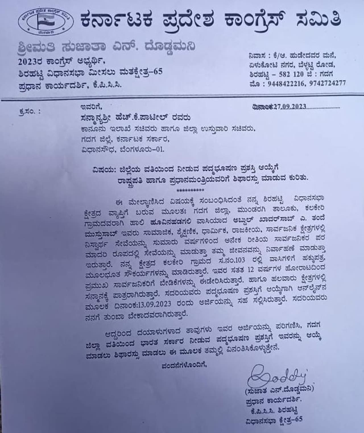 ಗ್ರಾಮದ ಅಭಿವೃದ್ಧಿಗಾಗಿ 12 ವರ್ಷದಿಂದ ಹೋರಾಟ ಹಾಗೂ ಗ್ರಾಮದಲ್ಲಿ ರಸ್ತೆ, ಮೂಲ ಸೌಕರ್ಯ ಕಲ್ಪಿಸಲು ಹೋರಾಟ ಮಾಡಿದ್ದೇನೆ. ಹೀಗಾಗಿ ಸಕೇಂದ್ರ ಸರ್ಕಾರಕ್ಕೆ ನನ್ನ ಹೆಸರು ಶಿಫಾರಸು ಮಾಡುವಂತೆ ಸಚಿವ ಎಚ್.ಕೆ. ಪಾಟೀಲ್ ಅವರಿಗೆ ಅಬ್ದುಲ್ ಖಾದರ್ ಸಾಬ್ ಮನವಿ ಮಾಡಿಕೊಂಡಿದ್ದಾರೆ.