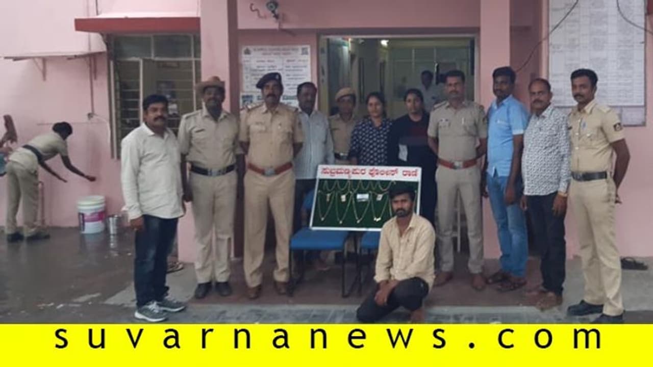ಬೆಂಗಳೂರು(ನ.22): ನಾಜೂಕಾಗಿ ಮಹಿಳೆಯರ ಮಾಂಗಲ್ಯ ಸರವನ್ನ ಕದಿಯುತ್ತಿದ್ದ ಕುಖ್ಯಾತಿಯ ಕಳ್ಳನನ್ನು ಬಂಧಿಸುವಲ್ಲಿ ನಗರದ ಸುಬ್ರಹ್ಮಣ್ಯಪುರ ಪೊಲೀಸರು ಯಶಸ್ವಿಯಾಗಿದ್ದಾರೆ. ಬಂಧಿತ ಖದೀಮನನ್ನು ಮಹಾದೇವ ಅಲಿಯಾಸ್, ಹೇಮಂತ್, ಬೈರೇಗೌಡ ಎಂದು ಗುರುತಿಸಲಾಗಿದೆ. ಈತ ಒಟ್ಟು ಮೂರು ಹೆಸರುಗಳಿಂದ ಪೊಲೀಸರಿಗೆ ಬೇಕಾಗಿದ್ದ ಎಂದು ತಿಳಿದುಬಂದಿದೆ.