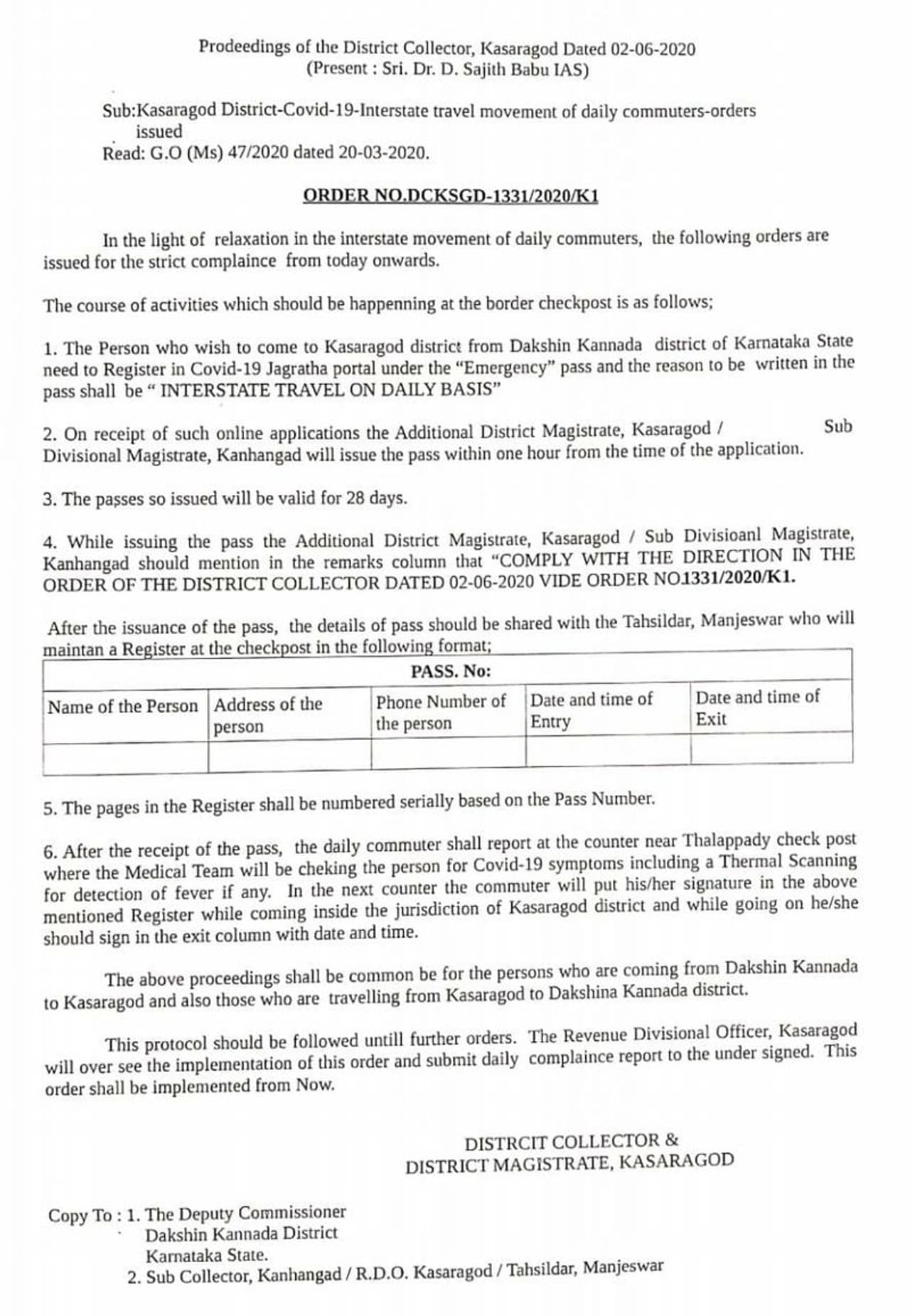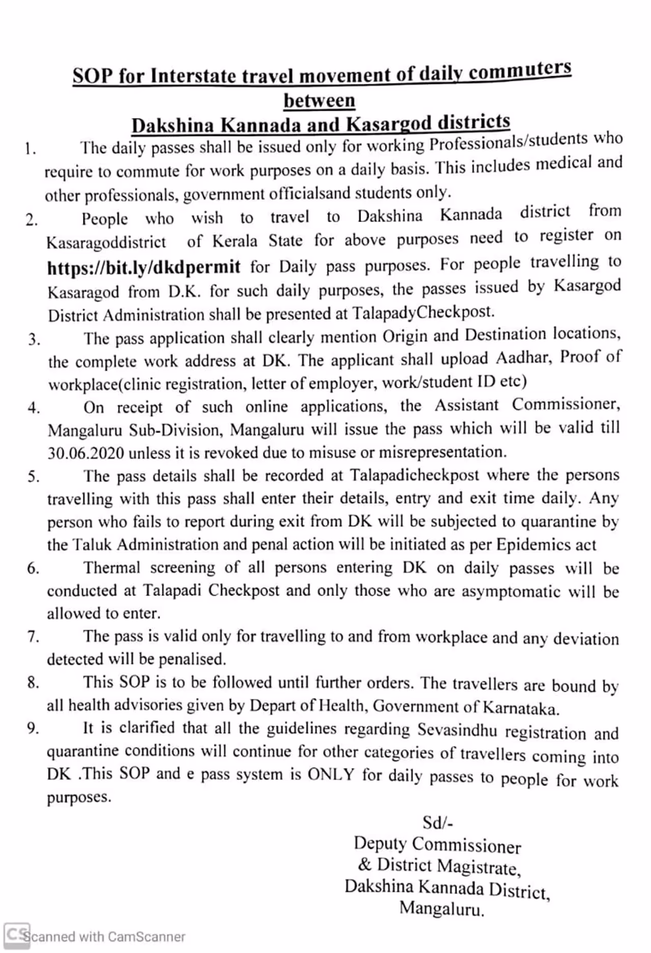 1) ಕಾಸರಗೋಡು ಹಾಗೂ ದ.ಕ. ಜಿಲ್ಲೆಯ ನಡುವಿನ ದೈನಂದಿನ ಓಡಾಟಕ್ಕಾಗಿ ಕಾಸರಗೋಡು ಹಾಗೂ ದ.ಕ. ಎರಡೂ ಜಿಲ್ಲಾಡಳಿತಗಳು ಪ್ರತ್ಯೇಕ ಪೋರ್ಟಲ್ ಗಳನ್ನು ತೆರೆದಿವೆ. ಆನ್ ಲೈನ್ ಮೂಲಕ ಈ ಪೋರ್ಟಲ್ ಗಳನ್ನು ಬಳಸಿ ಮೊಬೈಲಿನಲ್ಲೇ ಪಾಸ್ ಪಡೆಯಬಹುದು.