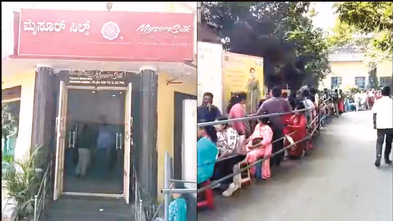 ಕರ್ನಾಟಕದ ಹೆಮ್ಮೆಯ ಮೈಸೂರು ಸಿಲ್ಕ್ ಸೀರೆಗಾಗಿ ಗ್ರಾಹಕರು ನಗರದ ಶೋರೂಂ ಮುಂದೆ ಮುಂಜಾನೆ 5 ಗಂಟೆಯಿಂದಲೇ ಕ್ಯೂ ನಿಂತಿದ್ದು, ಈ ವಿಡಿಯೋ ವೈರಲ್ ಆಗಿದೆ. ಮೈಸೂರಿನಲ್ಲಿರುವ ರೇಷ್ಮೆ ನೇಯ್ಗೆ ಕಾರ್ಖಾನೆ ಆವರಣದ ಮಳಿಗೆಗಳಲ್ಲಿ ಮಾತ್ರ ಮಾರಾಟ ಮಾಡಲಾಗುತ್ತದೆ.