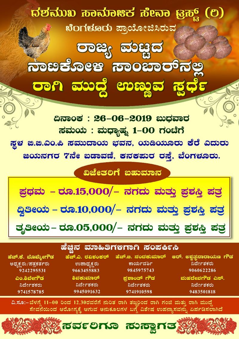 ಬೆಂಗಳೂರು, [ಮೇ.28]: ದಶಮುಕ ಸಾಮಾಜಿಕ ಟ್ರಸ್ಟ್ [ರಿ] ಬೆಂಗಳೂರು ವತಿಯಿಂದ ನಾಟಿ ಕೋಳಿ ಸಾಂಬಾರ್ ಜತೆ ರಾಗಿಮುದ್ದೆ ತಿನ್ನುವ ಸ್ಪರ್ಧೆ ಆಯೋಜಿಸಲಾಗಿದೆ.